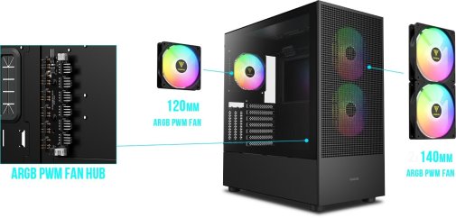 Однією з ключових особливостей TALOS M3 MESH є відмінна вентиляція. Корпус оснащений трьома вбудованими PWM-вентиляторами з ARGB-підсвічуванням: два 140-мм вентилятори спереду та один 120-мм ззаду. Вони забезпечують потужний повітряний потік, а 6-портовий хаб дозволяє синхронізувати підсвічування з материнською платою. Перфорована передня панель сприяє максимальному забору повітря, що покращує терморегуляцію. Корпус підтримує встановлення до трьох 120-мм або двох 140-мм вентиляторів спереду, а також радіатори водяного охолодження до 360 мм як спереду, так і зверху.