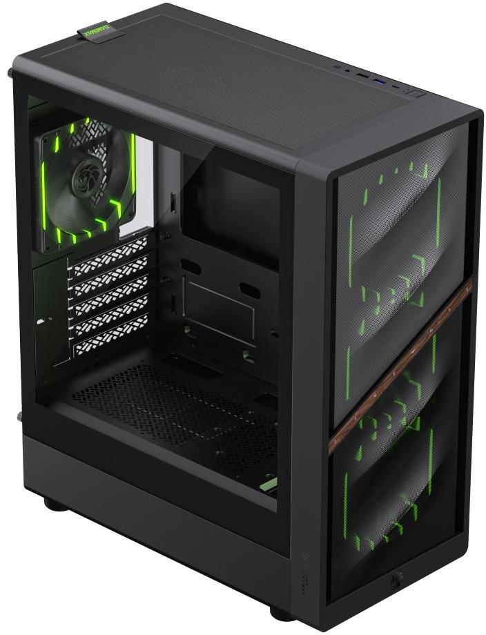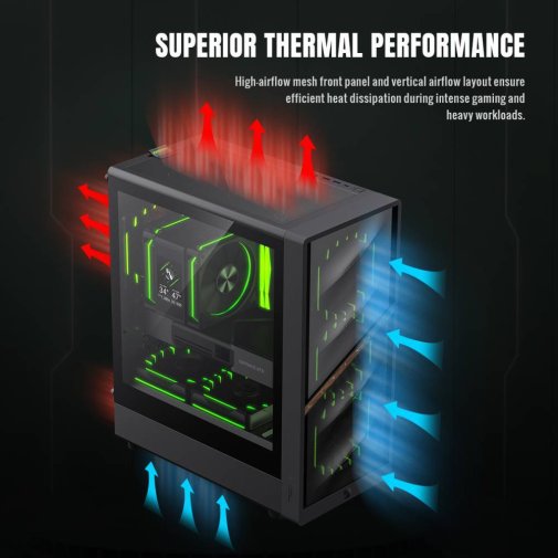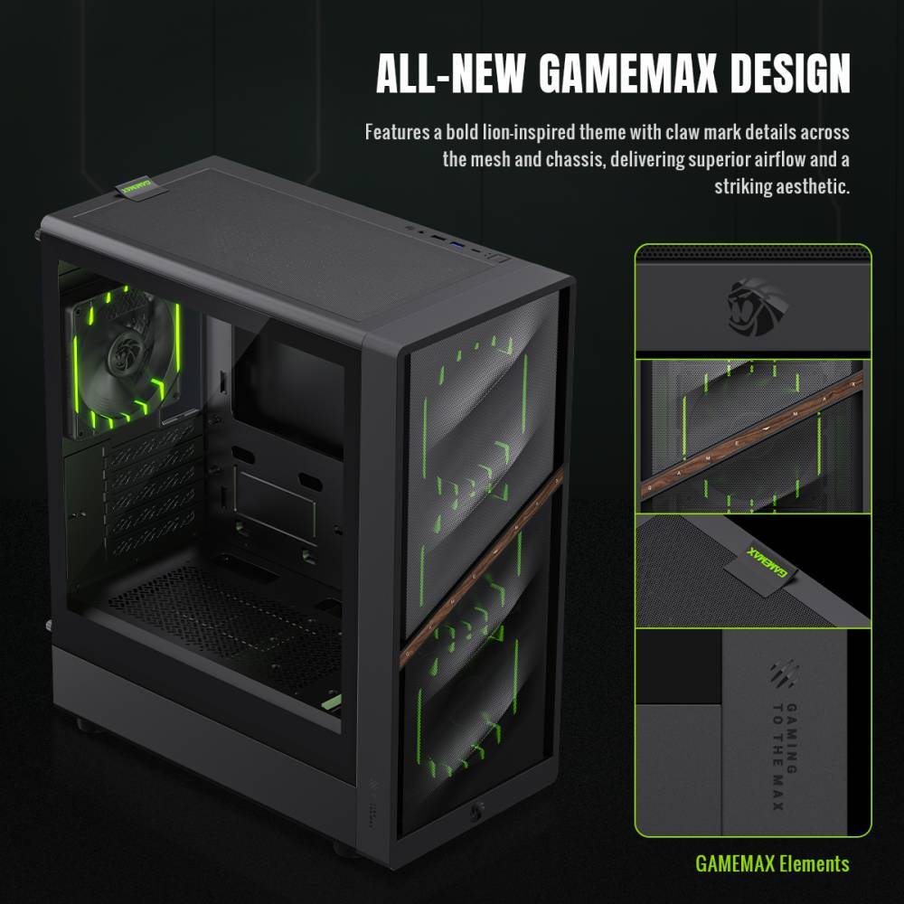Gamemax Aeris 330 M вражає сміливим дизайном із зображенням лева та слідами кігтів, що створює агресивний ігровий вигляд та забезпечує чудовий повітряний потік для охолодження компонентів. Передня панель із сітки та вертикальне розташування повітряного потоку гарантують ефективне розсіювання тепла навіть під час інтенсивних ігрових сесій та великих робочих навантажень.