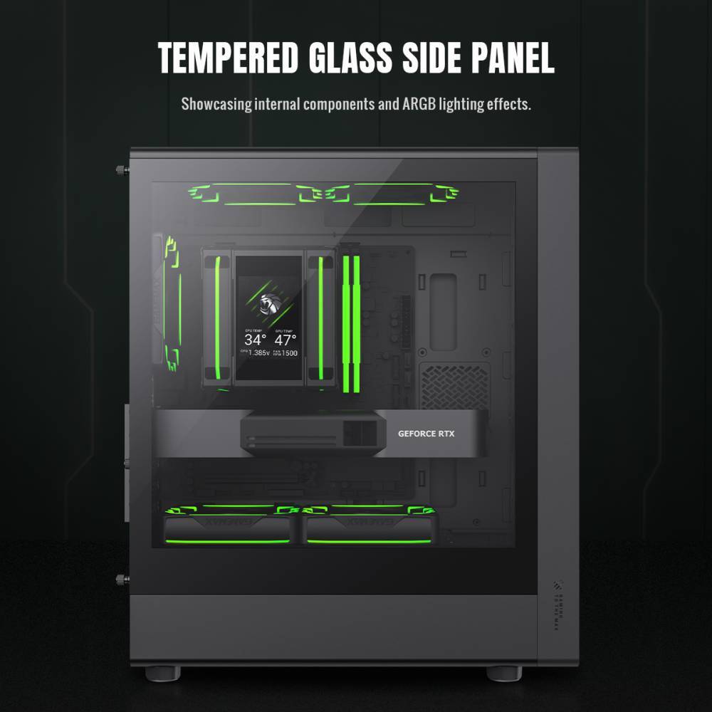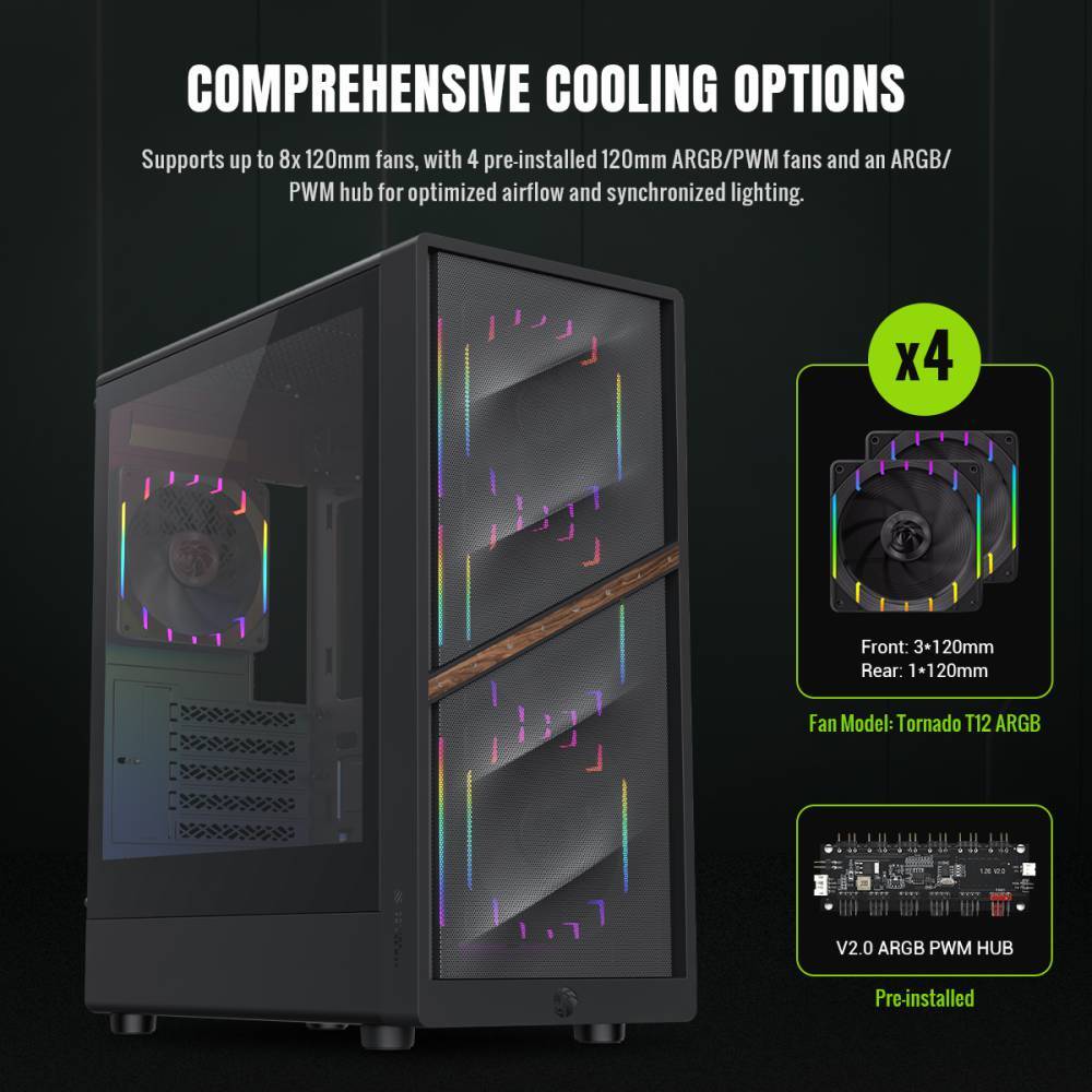 Gamemax Aeris 330 M оснащений 8 слотами для 120-мм вентиляторів, із 4 попередньо встановленими ARGB/PWM вентиляторами та концентратором ARGB/PWM для синхронізованого підсвічування та оптимізованого потоку повітря.