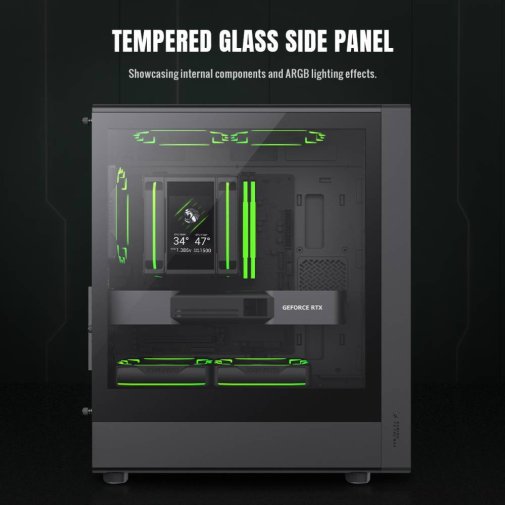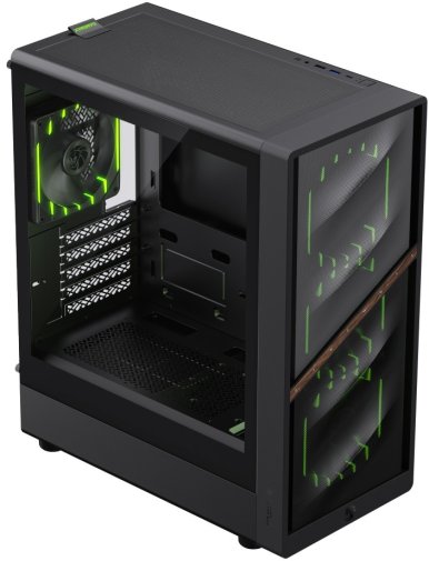 Для зручності підключення корпус пропонує сучасну панель введення/виведення з портом TYPE-C, USB 3.0, USB 2.0 та комбінованим аудіороз’ємом, що забезпечує швидкий доступ до периферії та готовність до майбутнього розширення.