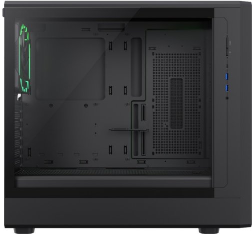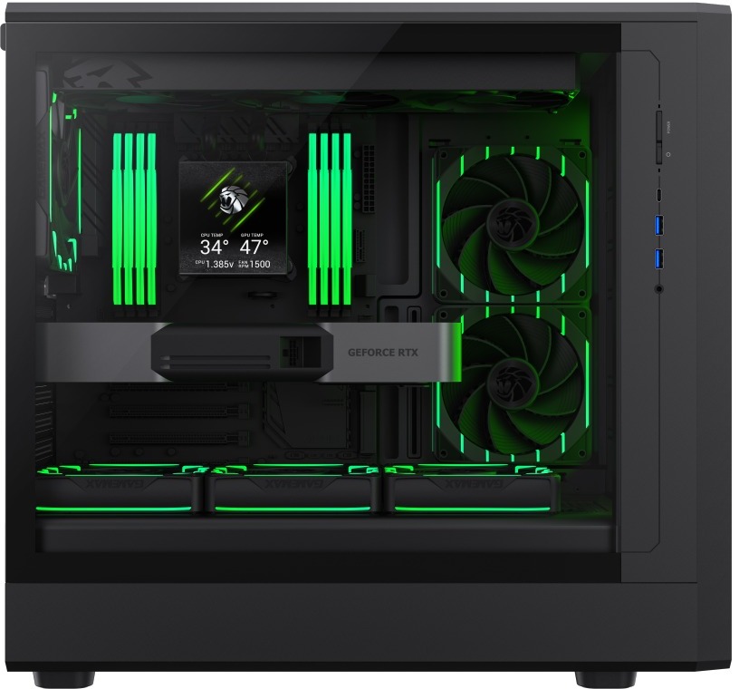 У комплекті вже встановлено чотири вентилятори ARGB з підтримкою PWM та контролером, що дозволяє не лише налаштовувати підсвічування, а й точно керувати швидкістю обертання для балансу між тишею та продуктивністю. На верхній панелі розташовані сучасні інтерфейси, зокрема порт Type-C Gen2 і USB 3.0, для швидкого підключення периферії.