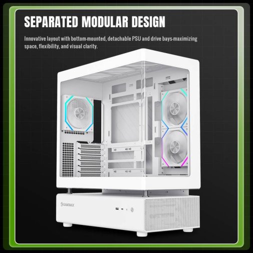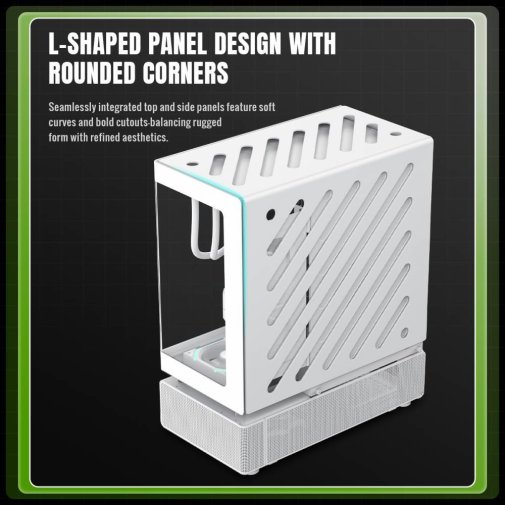 Відрізняється продуманою конструкцією з уважним ставленням до охолодження та оптимізацією повітряного потоку. Бокова панель прозора, тому внутрішні компоненти системи будуть відкриті для огляду. Користувач зможе підбирати яскраві на вигляд планки оперативної пам'яті, відеокарти, накопичувачі та кулери.