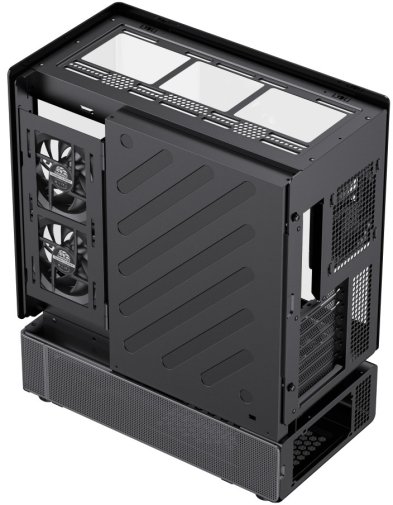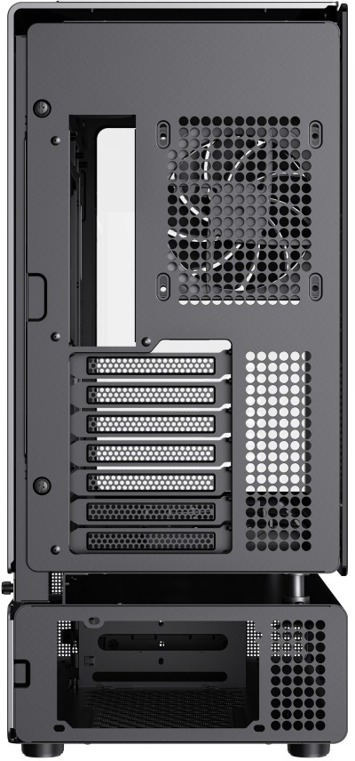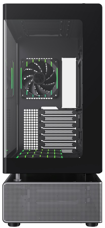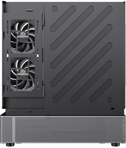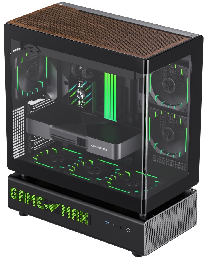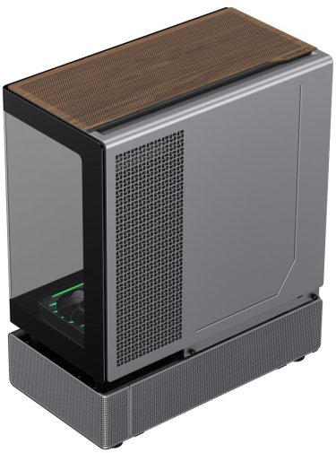 Однією з ключових особливостей є панорамне скло з кутом огляду 270°, виконане з цільноформованого загартованого скла з захисною плівкою проти розльоту уламків. Фронтальна панель оснащена вбудованим екраном на базі 512 LED-матриці, який відображає системну інформацію або дозволяє створювати власні візуальні ефекти. Верхня панель має сітчасту структуру з декоративним елементом під дерево, що додає естетичності.