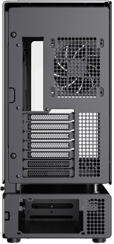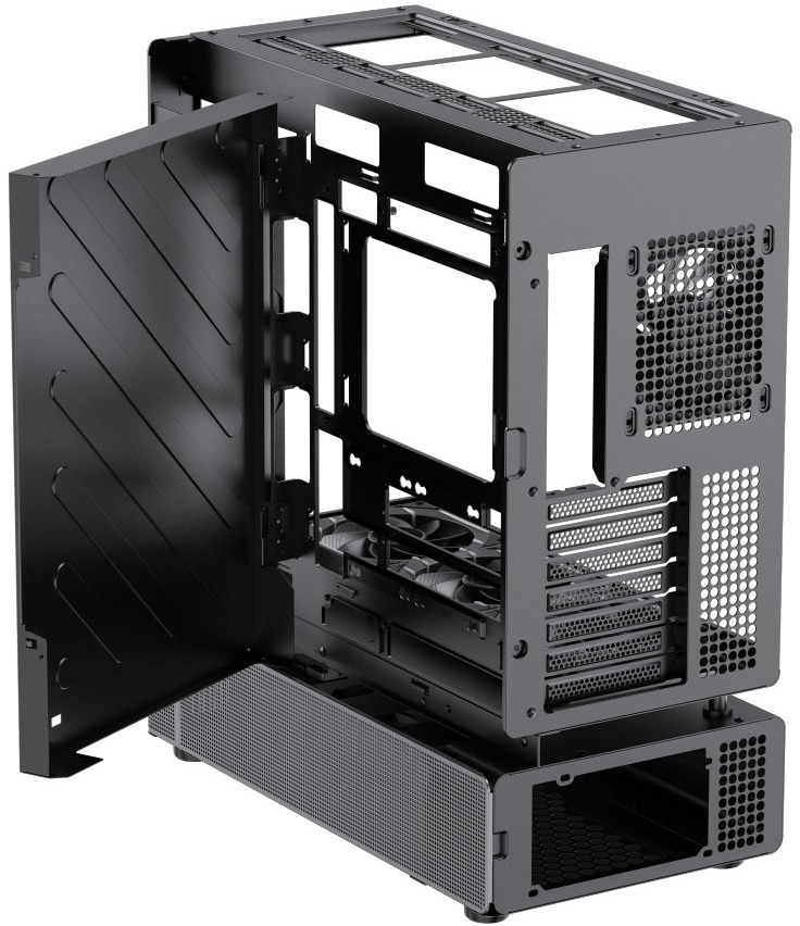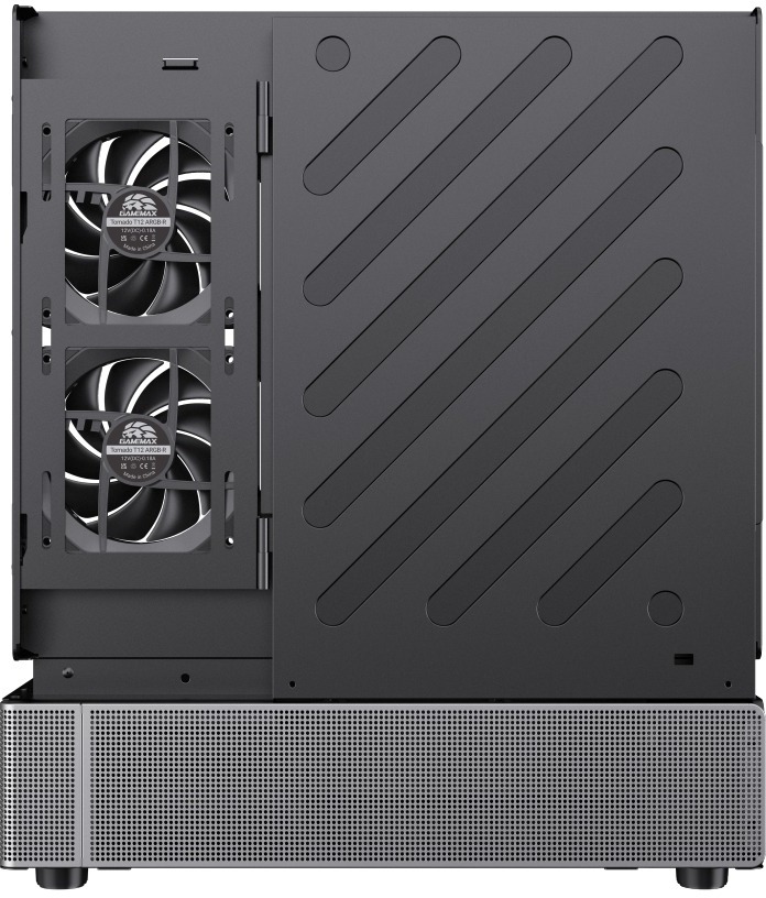 Система охолодження продумана для максимальної ефективності: корпус постачається з шістьма попередньо встановленими ARGB PWM-вентиляторами Tornado T12, розміщеними на задній панелі, біля материнської плати та внизу. Підтримуються додаткові радіатори до 360 мм зверху, а бічна та розділена камера забезпечують оптимальний повітряний потік. Пилові фільтри та зручне розміщення компонентів роблять його практичним для тривалого використання.
