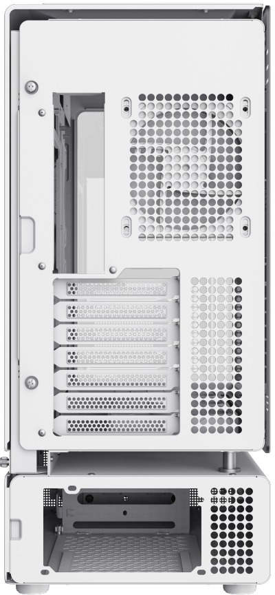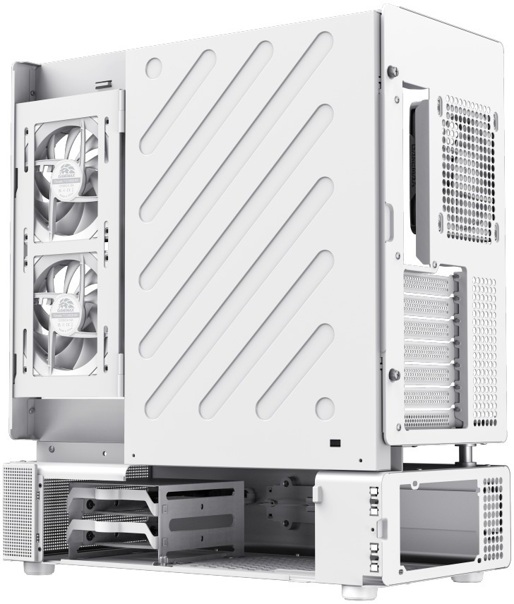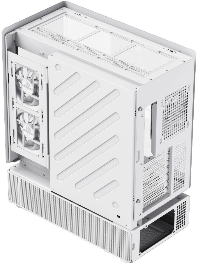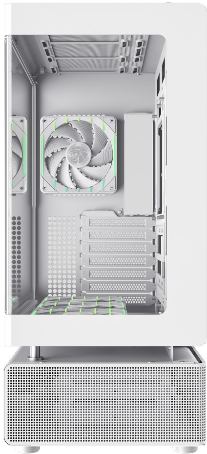 Система охолодження продумана для максимальної ефективності: корпус постачається з шістьма попередньо встановленими ARGB PWM-вентиляторами Tornado T12, розміщеними на задній панелі, біля материнської плати та внизу. Підтримуються додаткові радіатори до 360 мм зверху, а бічна та розділена камера забезпечують оптимальний повітряний потік. Пилові фільтри та зручне розміщення компонентів роблять його практичним для тривалого використання.