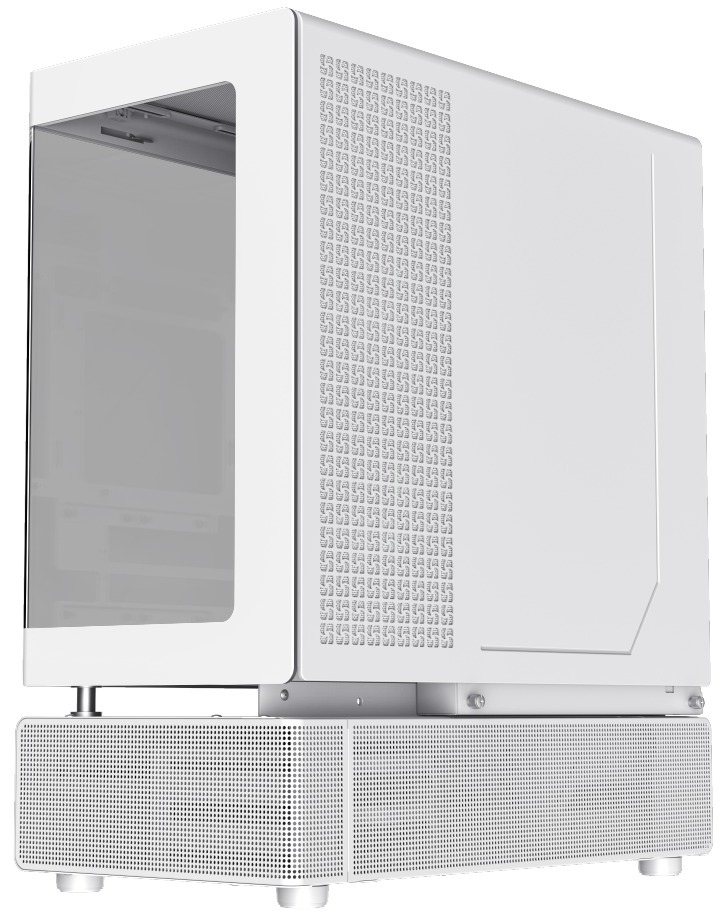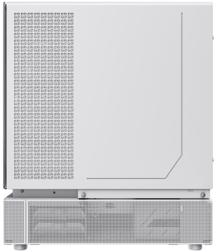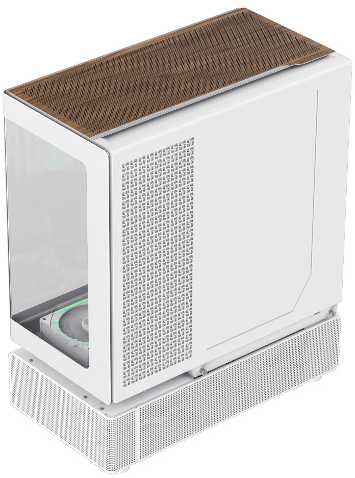 Однією з ключових особливостей є панорамне скло з кутом огляду 270°, виконане з цільноформованого загартованого скла з захисною плівкою проти розльоту уламків. Фронтальна панель оснащена вбудованим екраном на базі 512 LED-матриці, який відображає системну інформацію або дозволяє створювати власні візуальні ефекти. Верхня панель має сітчасту структуру з декоративним елементом під дерево, що додає естетичності.