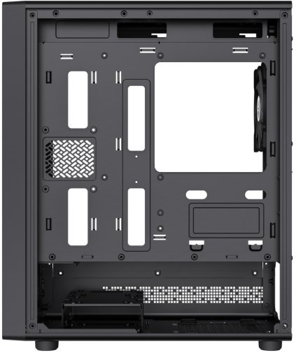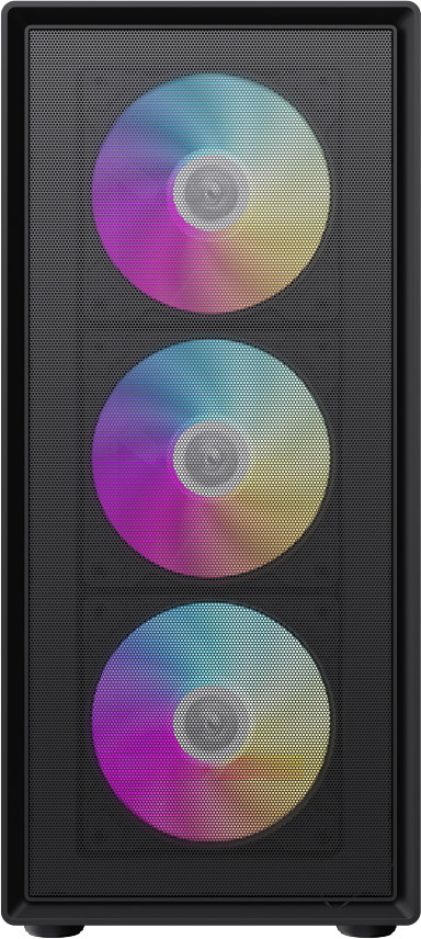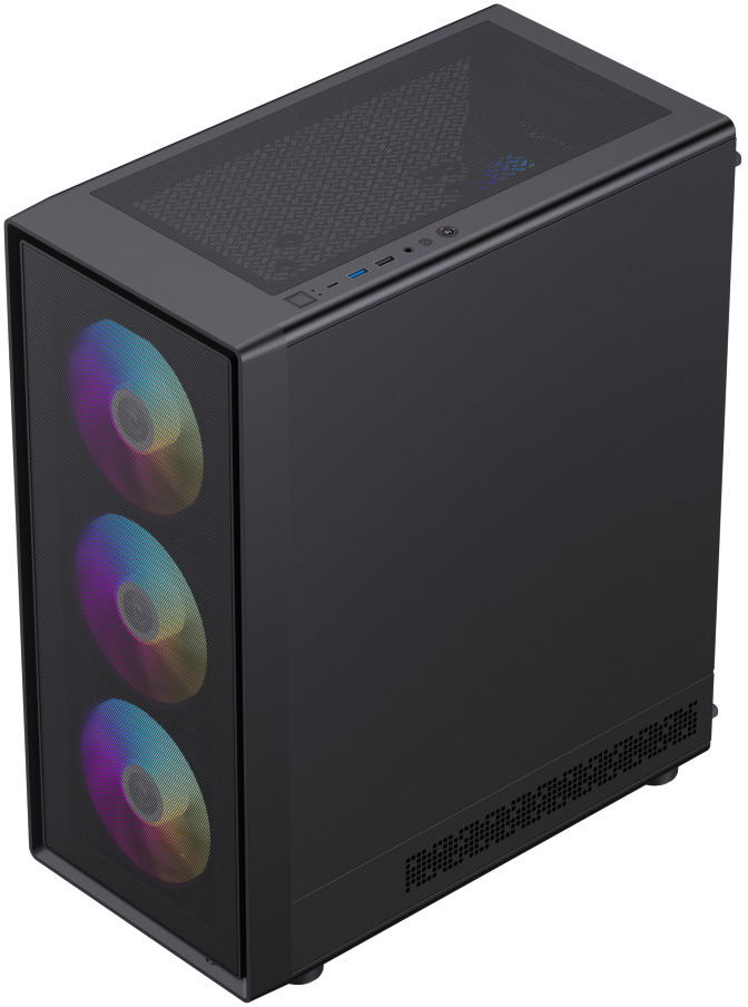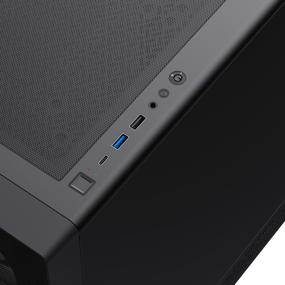 Зовнішній вигляд корпусу привертає увагу завдяки лівій бічній панелі з загартованого скла, крізь яку чудово видно RGB-підсвітку всередині. Передня панель поєднує ABS-пластик і сітчасту вставку MESH, яка покращує вентиляцію та додає стиль. Права бічна панель металева — вона надійно захищає нутрощі ПК. Пиловловлюючі фільтри зверху та знизу допомагають підтримувати чистоту всередині корпусу. На верхній панелі розміщені два USB 3.0 порти, один порт Type-C та комбінований аудіороз'єм — усе необхідне завжди під рукою.
