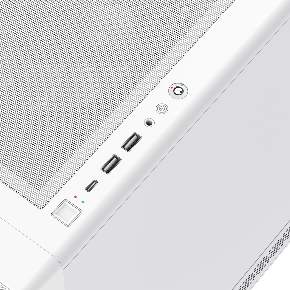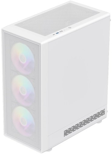 Зовнішній вигляд корпусу привертає увагу завдяки лівій бічній панелі з загартованого скла, крізь яку чудово видно RGB-підсвітку всередині. Передня панель поєднує ABS-пластик і сітчасту вставку MESH, яка покращує вентиляцію та додає стиль. Права бічна панель металева — вона надійно захищає нутрощі ПК. Пиловловлюючі фільтри зверху та знизу допомагають підтримувати чистоту всередині корпусу. На верхній панелі розміщені два USB 3.0 порти, один порт Type-C та комбінований аудіороз'єм — усе необхідне завжди під рукою.