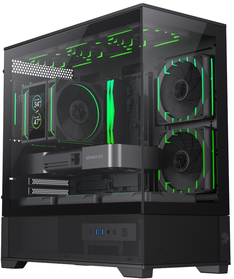 Корпус уже комплектується трьома ARGB PWM-вентиляторами, які забезпечують ефективне охолодження та створюють привабливе RGB-підсвічування. У комплекті йде сучасний контролер V5.0 PWM ARGB HUB, що підтримує до 6 вентиляторів і 6 світлодіодних стрічок, а також зручний пульт дистанційного керування. Завдяки підтримці як повітряного, так і рідинного охолодження (зокрема радіаторів до 360 мм зверху) VISTA 2 легко адаптується до потужних систем.
