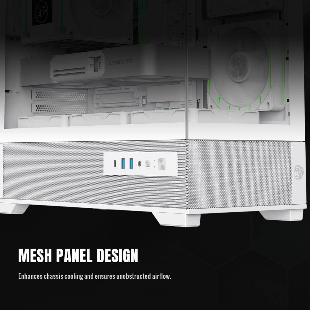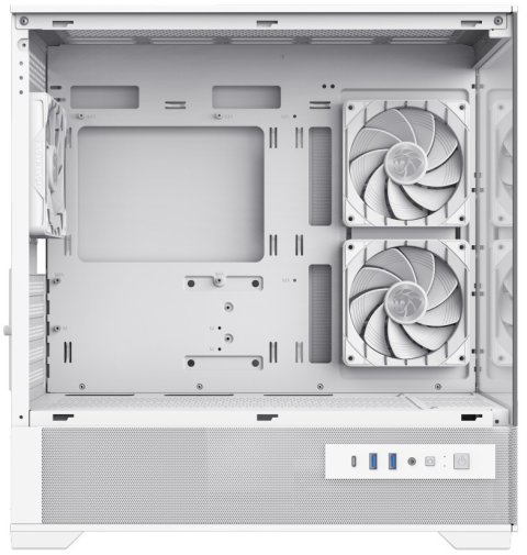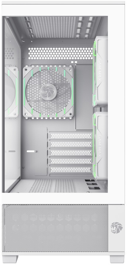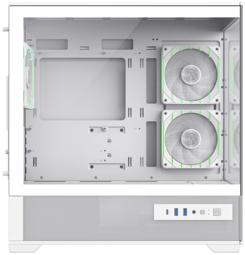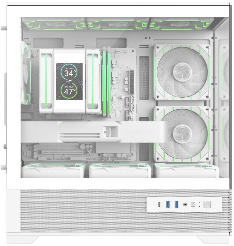 Зовнішні панелі доповнені пиловими сітками зверху та знизу, що допомагає підтримувати чистоту всередині. На бічній панелі розташовані два USB 3.2 Gen1, один USB Type-C Gen2, аудіороз’єм та кнопки керування живленням і підсвічуванням. GameMax VISTA 2 поєднує стильний зовнішній вигляд, хорошу вентиляцію та практичність, що робить його привабливим вибором для геймерів і ентузіастів, які цінують видимість своєї збірки.