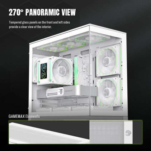 GameMax VISTA 2 — це компактний корпус форм-фактора Mini Tower, спеціально розроблений для материнських плат Micro-ATX та Mini-ITX. Його головною особливістю є 270-градусний панорамний огляд завдяки великій кількості загартованого скла: фронтальна панель поєднує скло з сіткою, а лівий бік повністю виконаний із прозорого скла. Такий дизайн дозволяє милуватися компонентами системи з різних ракурсів, підкреслюючи естетику сучасних збірок.