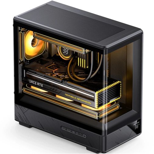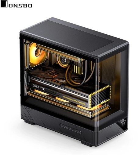 Корпус JONSBO D200 є ідеальним поєднанням естетики та функціональності, привертаючи увагу своїм витонченим дизайном та інноваційними рішеннями. Одним із ключових елементів зовнішнього вигляду є вигнуте цільне загартоване скло, яке забезпечує захопливий огляд внутрішніх компонентів. Це не лише дозволяє милуватися внутрішньою будовою, але й дає змогу легко стежити за чистотою та станом системи. Вбудований цифровий дисплей слугує важливим доповненням, дозволяючи користувачам у реальному часі відстежувати температуру всередині корпусу та своєчасно реагувати на зміни.