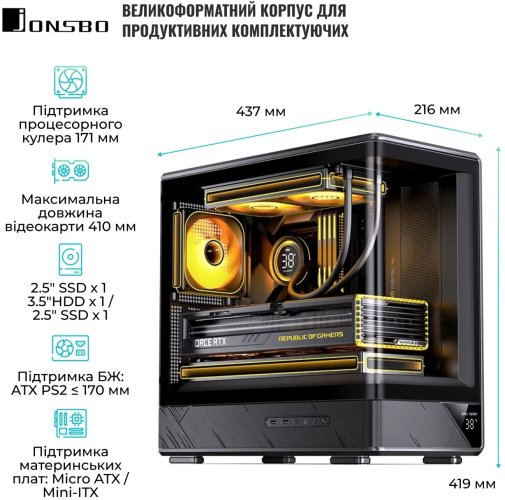 Попри свої компактні розміри, JONSBO D200 здатний вмістити довгі відеокарти довжиною до 410 мм, що робить його універсальним вибором для сучасних ігрових та робочих станцій. Продумане розміщення внутрішніх компонентів забезпечує зручність при складанні та дозволяє легко керувати кабельною системою, що сприяє покращеному повітряному потоку та підтриманню оптимальної температури всередині корпусу.