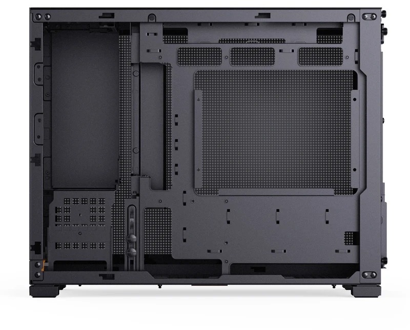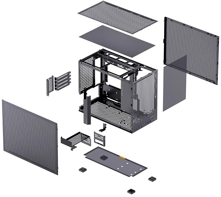 Всередині легко розміщуються материнські плати Mini-ITX та Micro-ATX. Висота процесорного кулера може сягати 170 мм, а довжина відеокарти – до 365 мм, що дозволяє використовувати більшість сучасних топових карт. Блок живлення ATX довжиною до 200 мм встановлюється у нижній частині, прихований кожухом, що додає акуратності збірці.