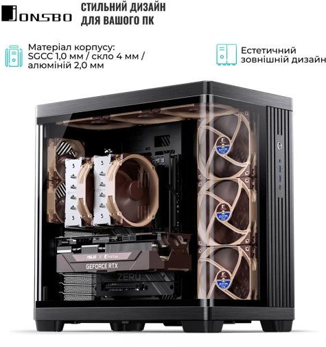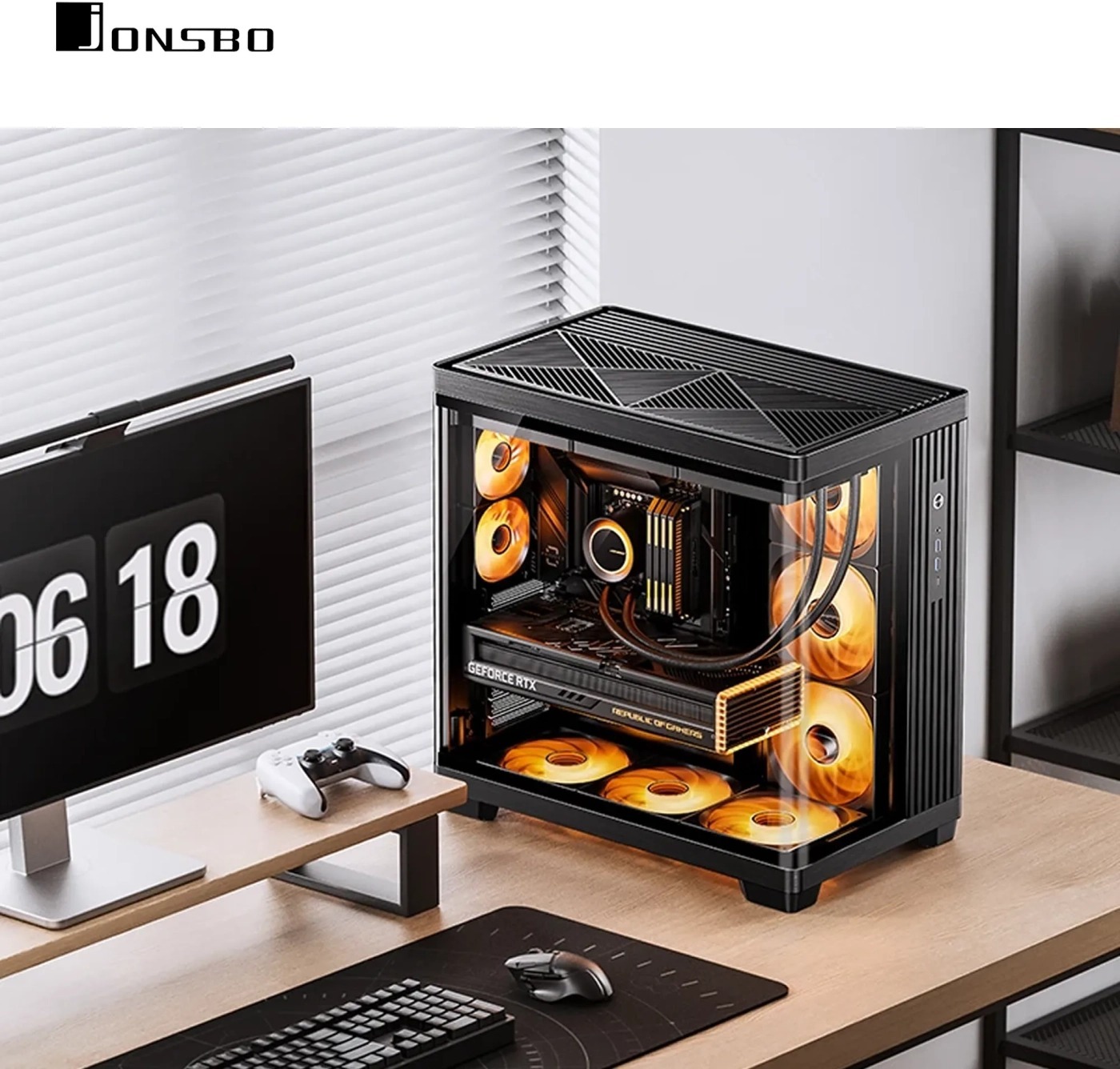 Однією з ключових особливостей JONSBO TK-4 є його ефектний дизайн із загартованим склом подвійної кривини, що забезпечує панорамний огляд на 2,5 сторони. Це не лише робить корпус візуально привабливим, але й дозволяє милуватися внутрішніми компонентами з різних кутів. Такий підхід чудово підходить для демонстрації світлодіодного підсвічування та інших декоративних елементів всередині корпусу. Розміщення на столі стає не просто практичним питанням, а цілим мистецтвом, адже корпус гармонійно вписується в будь-який інтер'єр, стаючи його центральним елементом.