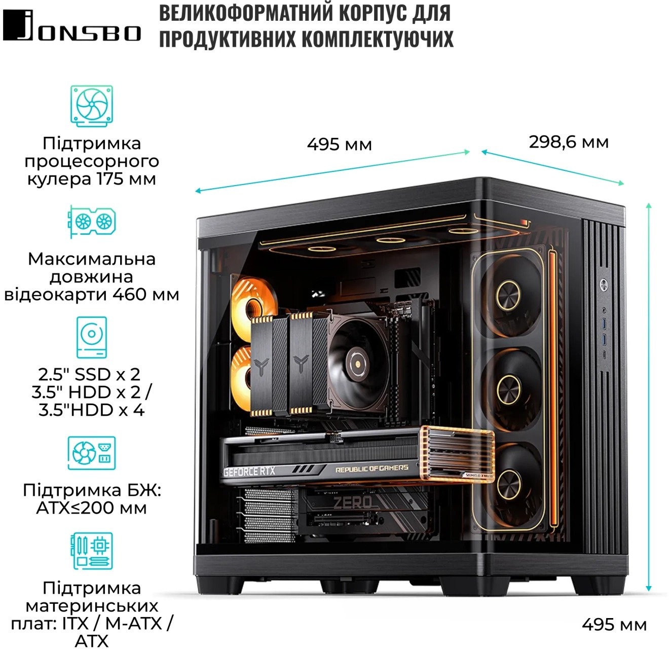 Користувацькі можливості JONSBO TK-4 також вражають. Корпус підтримує до 11 позицій для вентиляторів і до 8 слотів PCI, що дозволяє створити потужну та стабільну систему охолодження. Можливість встановлення систем рідинного охолодження (СРО) довжиною до 420 мм робить його ідеальним вибором для геймерів та ентузіастів, які прагнуть до оптимальної продуктивності своїх ПК. Сумісність із відеокартами довжиною до 460 мм надає широкий вибір графічних рішень, що особливо важливо для тих, хто працює з ресурсомісткими застосунками або іграми.