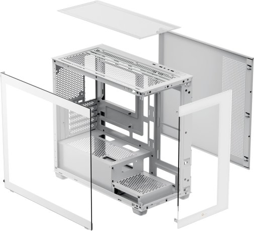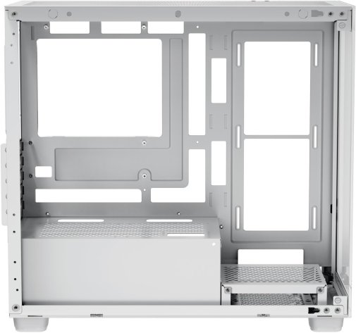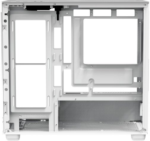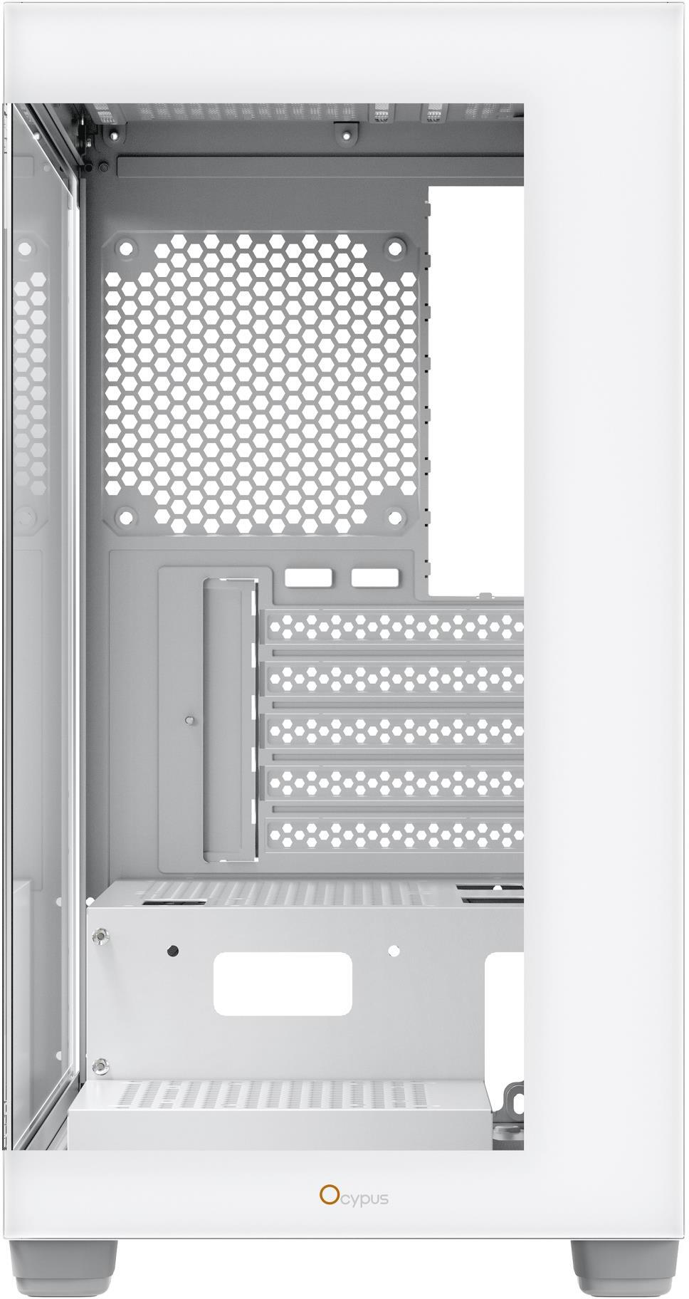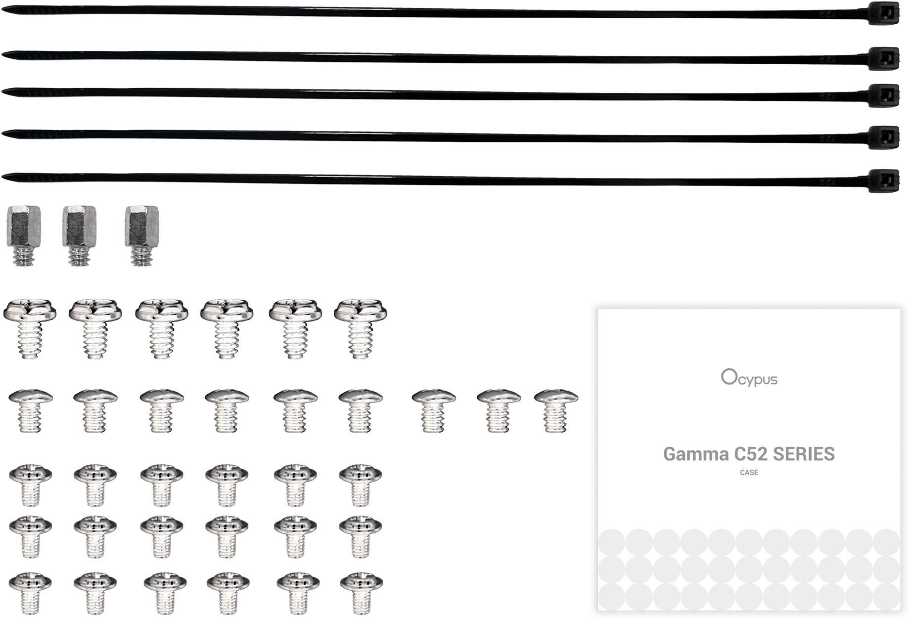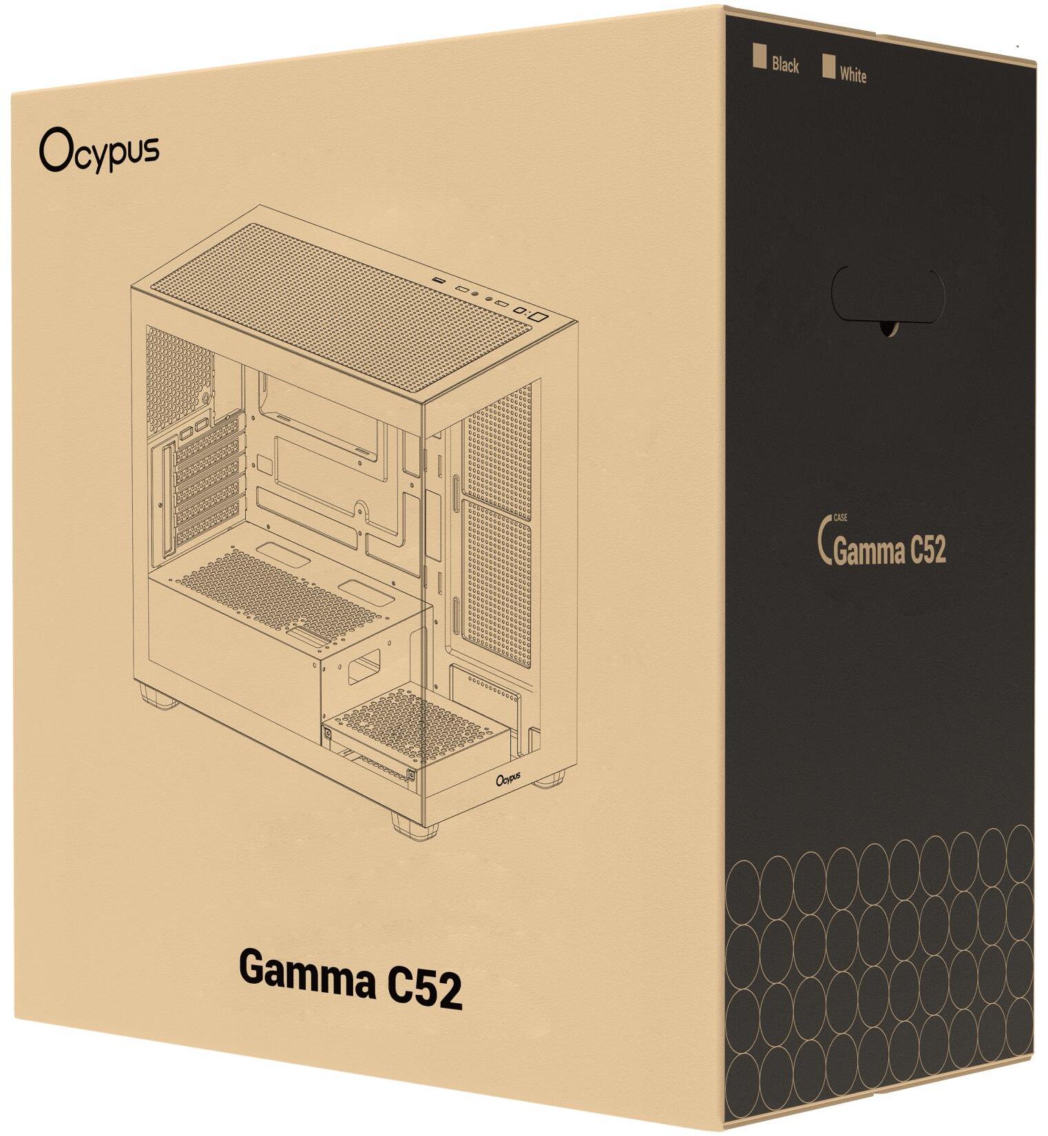 Конструкція Ocypus Gamma C52 акцентує на балансі між вентиляцією та дизайном: панорамна передня панель з загартованого скла поєднується з перфорованою сіткою для посиленого потоку повітря. Внутрішня організація включає просторі камери для розмежування компонентів, з підтримкою материнських плат до mATX, графічних карт довжиною до 425 мм і процесорних кулерів висотою до 170 мм, а також слотів для накопичувачів — двох відсіків для 3.5" HDD або комбінації з 2.5" SSD, — що робить корпус придатним для систем з високим навантаженням. Система керування кабелями з оптимізованими каналами та стяжками, включеними в комплект, полегшує збірку, забезпечуючи акуратний вигляд і максимальний потік повітря, з можливістю розширення вентиляції для адаптації під конкретні сценарії, включаючи сумісність з радіаторами для водяного охолодження.