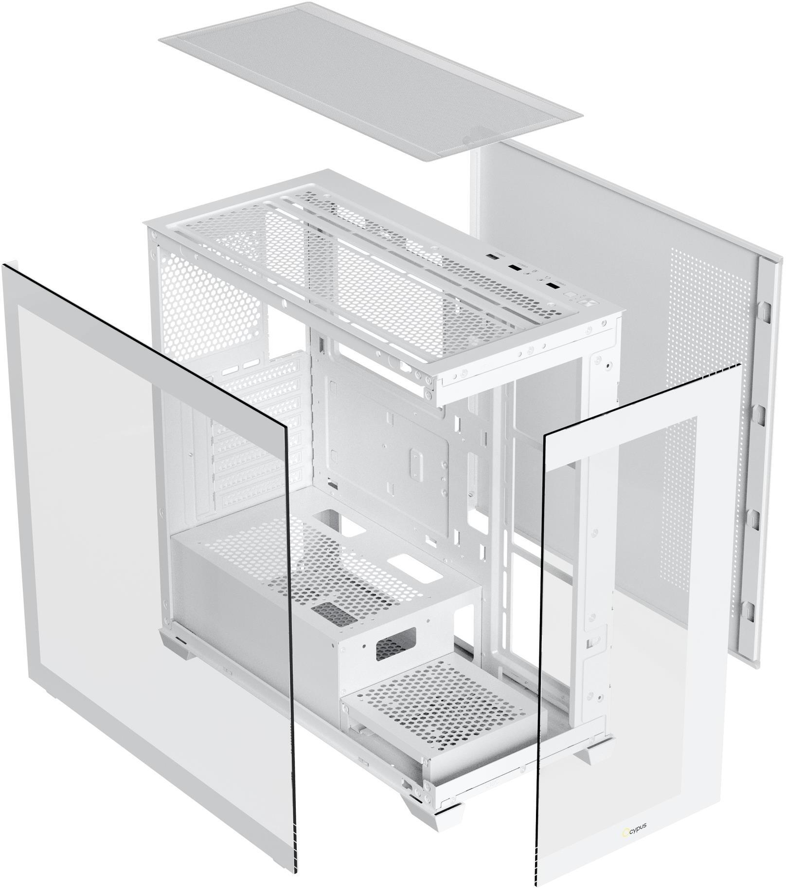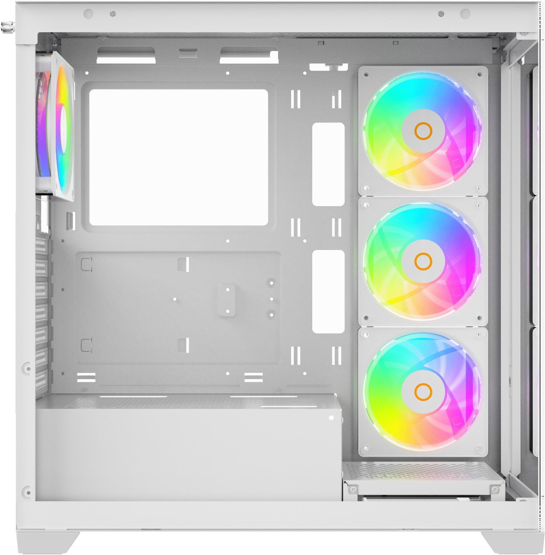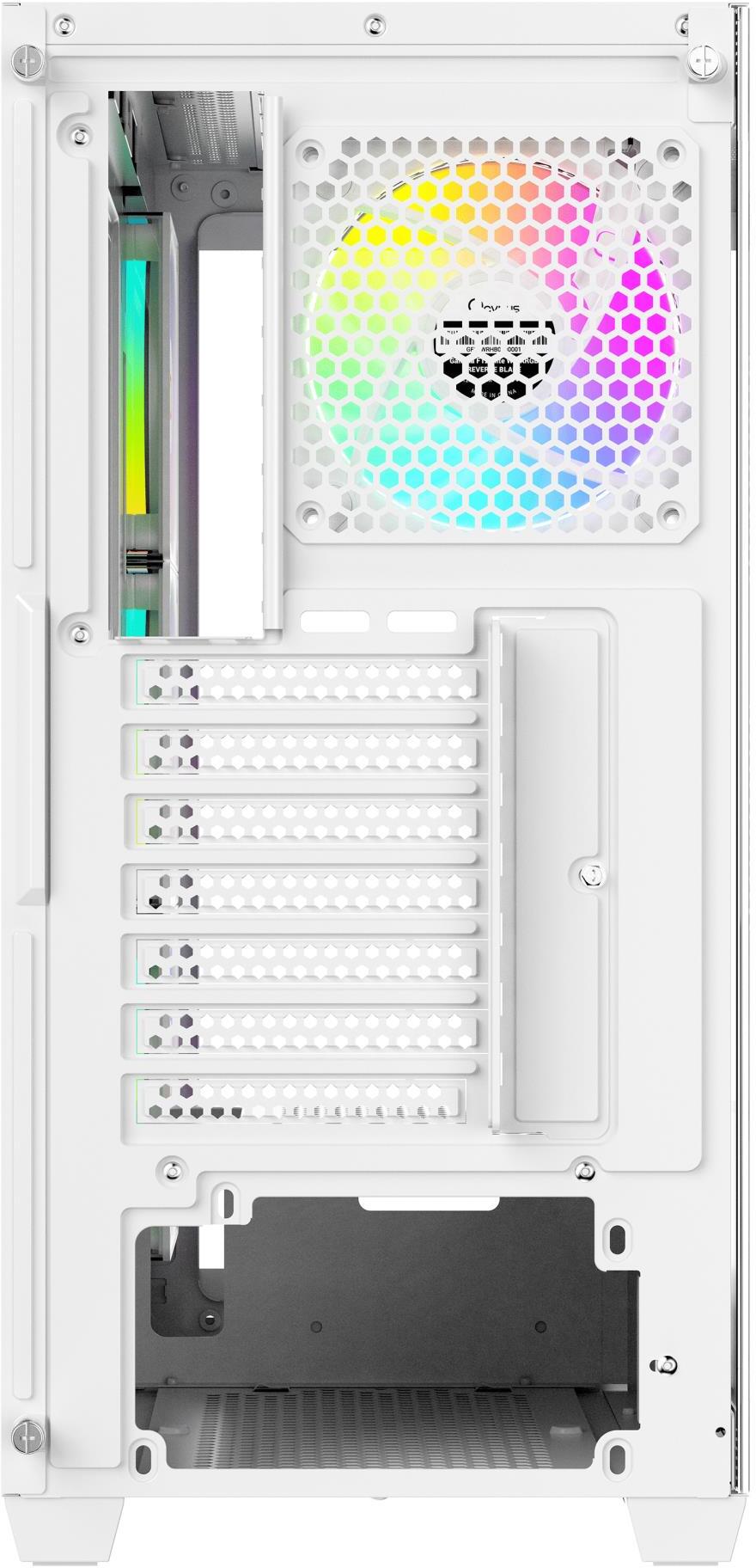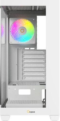 Конструкція Ocypus Gamma C72 ARGB акцентує на балансі між вентиляцією та дизайном: панорамна передня панель з загартованого скла поєднується з перфорованою сіткою для посиленого потоку повітря, оснащена чотирма попередньо встановленими 120-мм вентиляторами з ARGB-підсвічуванням, що не тільки забезпечують ефективне охолодження процесора, графічного процесора та накопичувачів, але й створюють яскраву, кастомізовану RGB-атмосферу для ігрового настрою. Внутрішня організація включає просторі камери для розмежування компонентів, з підтримкою материнських плат до mATX, графічних карт довжиною до 425 мм і процесорних кулерів висотою до 170 мм, а також слотів для накопичувачів — двох відсіків для 3.5" HDD або комбінації з 2.5" SSD, — що робить корпус придатним для систем з високим навантаженням. Система керування кабелями з оптимізованими каналами та стяжками, включеними в комплект, полегшує збірку, забезпечуючи акуратний вигляд і максимальний потік повітря, з можливістю розширення вентиляції для адаптації під конкретні сценарії, включаючи сумісність з радіаторами для водяного охолодження.