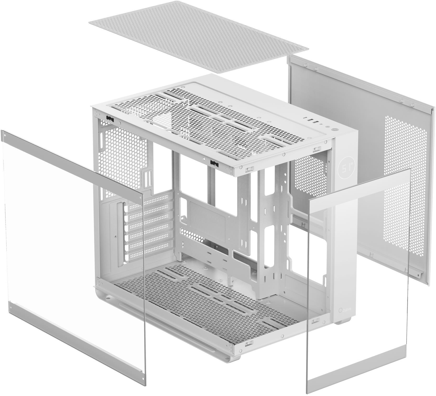 Конструкція корпусу виготовлена з міцної сталі SPCC товщиною 0,7 мм, що гарантує довговічність і стійкість до вібрацій. Металеві елементи мають плавні, закруглені краї, поєднуючи естетику та надійність. Швидкознімна конструкція із засувками дозволяє легко встановлювати та обслуговувати компоненти без використання інструментів, а багаторівневий захист від пилу з магнітними фільтрами зверху, знизу та збоку підтримує чистоту всередині корпусу.