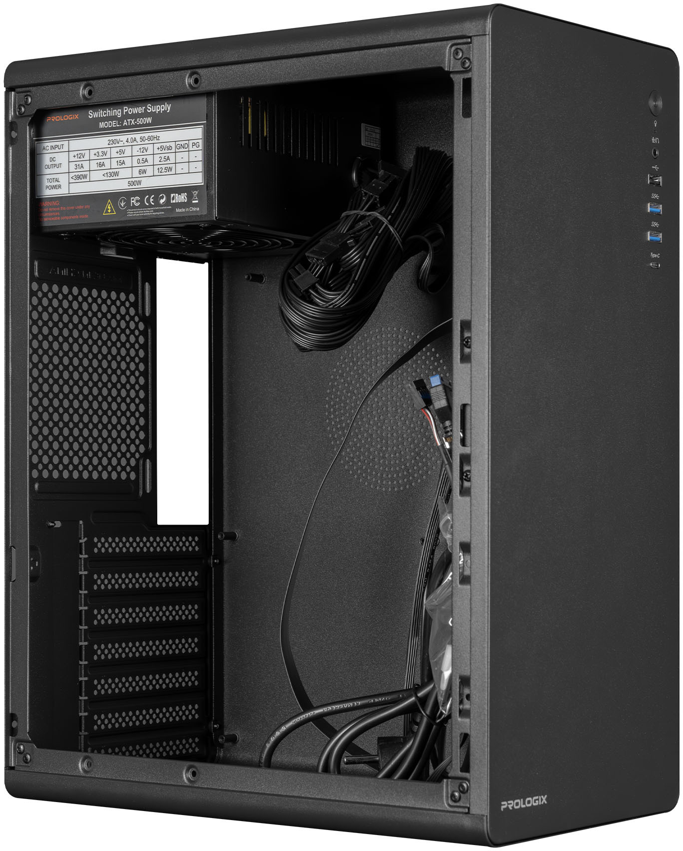 Корпус ProLogix E127 500W є бюджетним рішенням від українського бренду ProLogix, призначеним для складання офісних або домашніх персональних комп'ютерів. Ця модель поєднує в собі класичний дизайн у чорному кольорі з вбудованим блоком живлення потужністю 500 Вт, що дозволяє відразу почати збірку без додаткових витрат на окремий PSU.