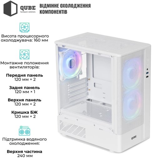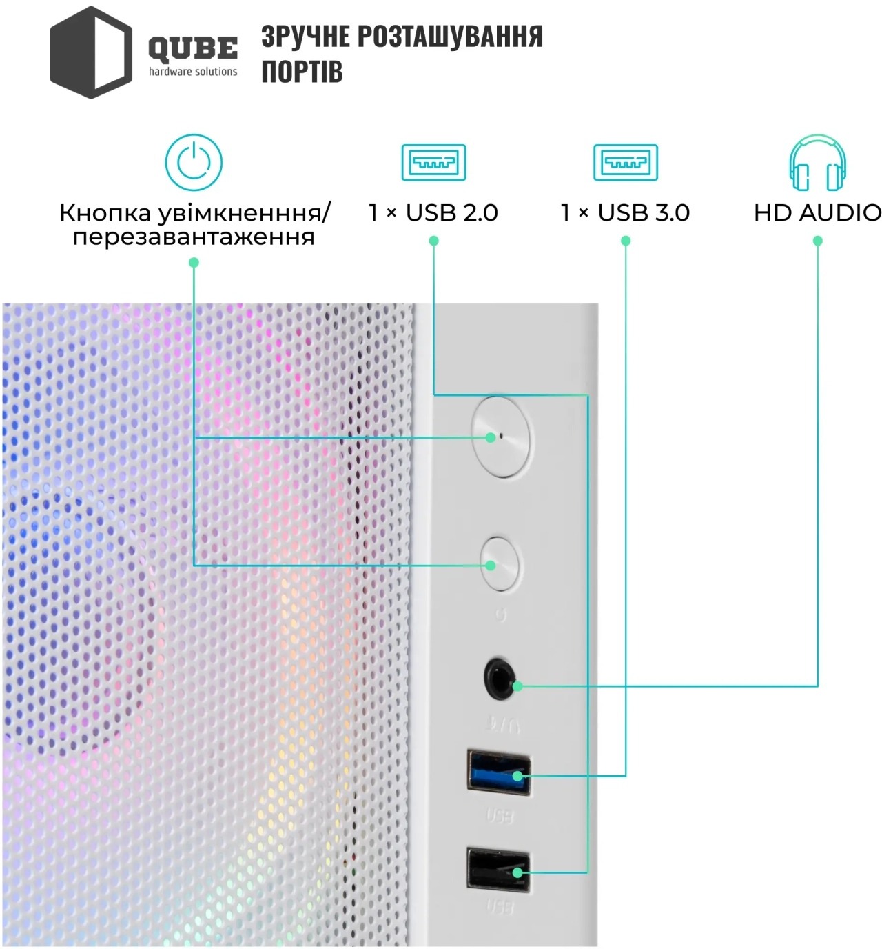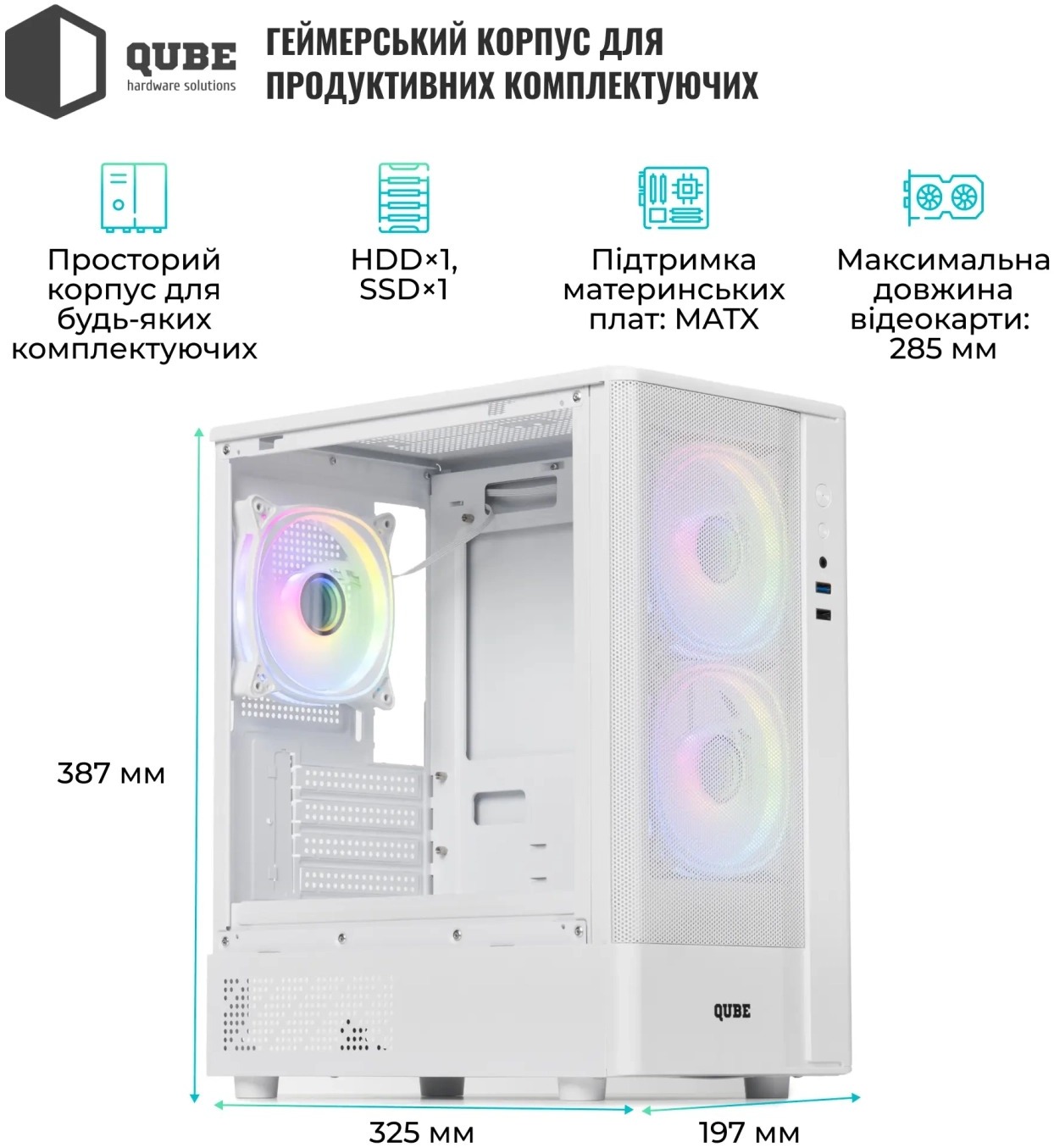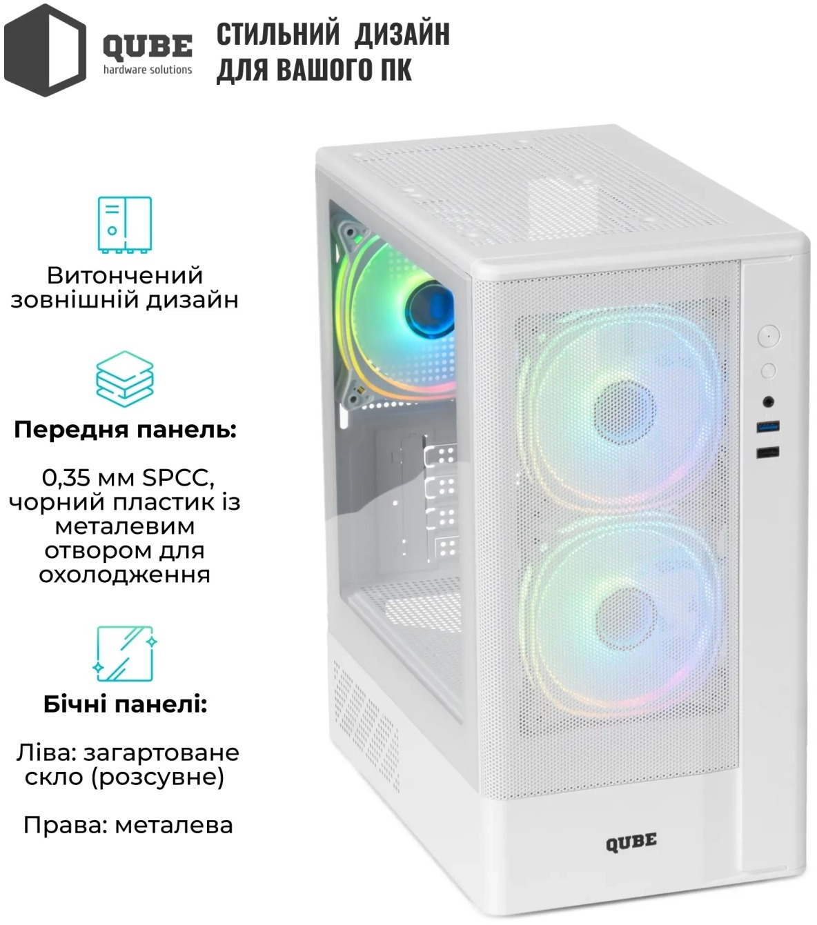 Корпус QUBE GEON ARGB Black – це компактне і сучасне рішення для збірки ПК формату mATX, яке поєднує стильний дизайн, практичність і надійність. Його конструкція виконана з міцної сталі товщиною 0,35 мм, а фронтальна панель з пластику з металевою решіткою забезпечує додатковий приплив повітря та покращене охолодження. Ліва бічна панель із загартованого скла з розсувним механізмом дозволяє легко отримати доступ до комплектувальних і одночасно підкреслює зовнішній вигляд системи з підсвічуванням. Права панель металева, що додає жорсткості корпусу. При габаритах 325×197×387 мм корпус залишається компактним, зберігаючи всі ключові можливості для збірки продуктивної системи.