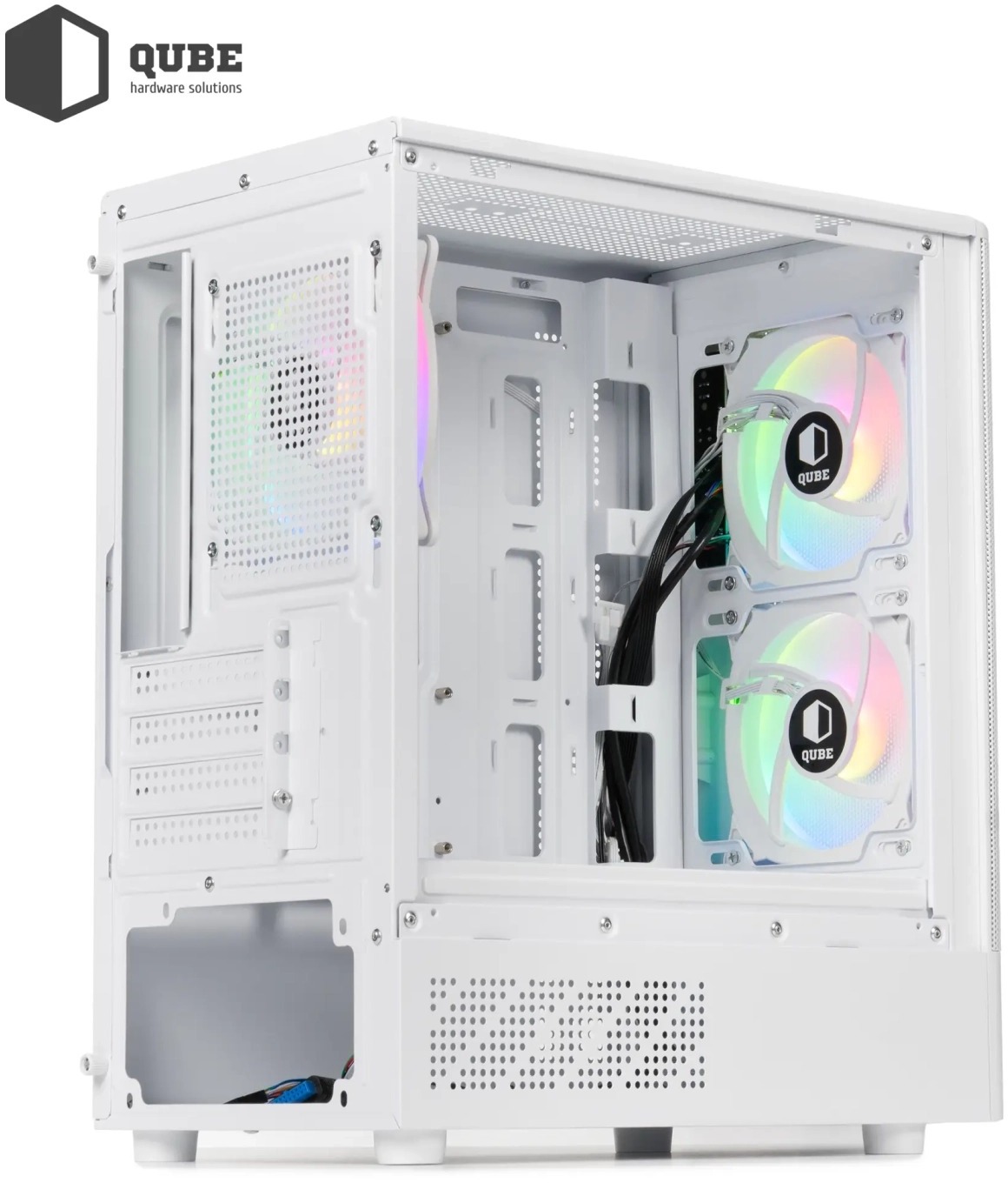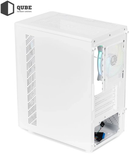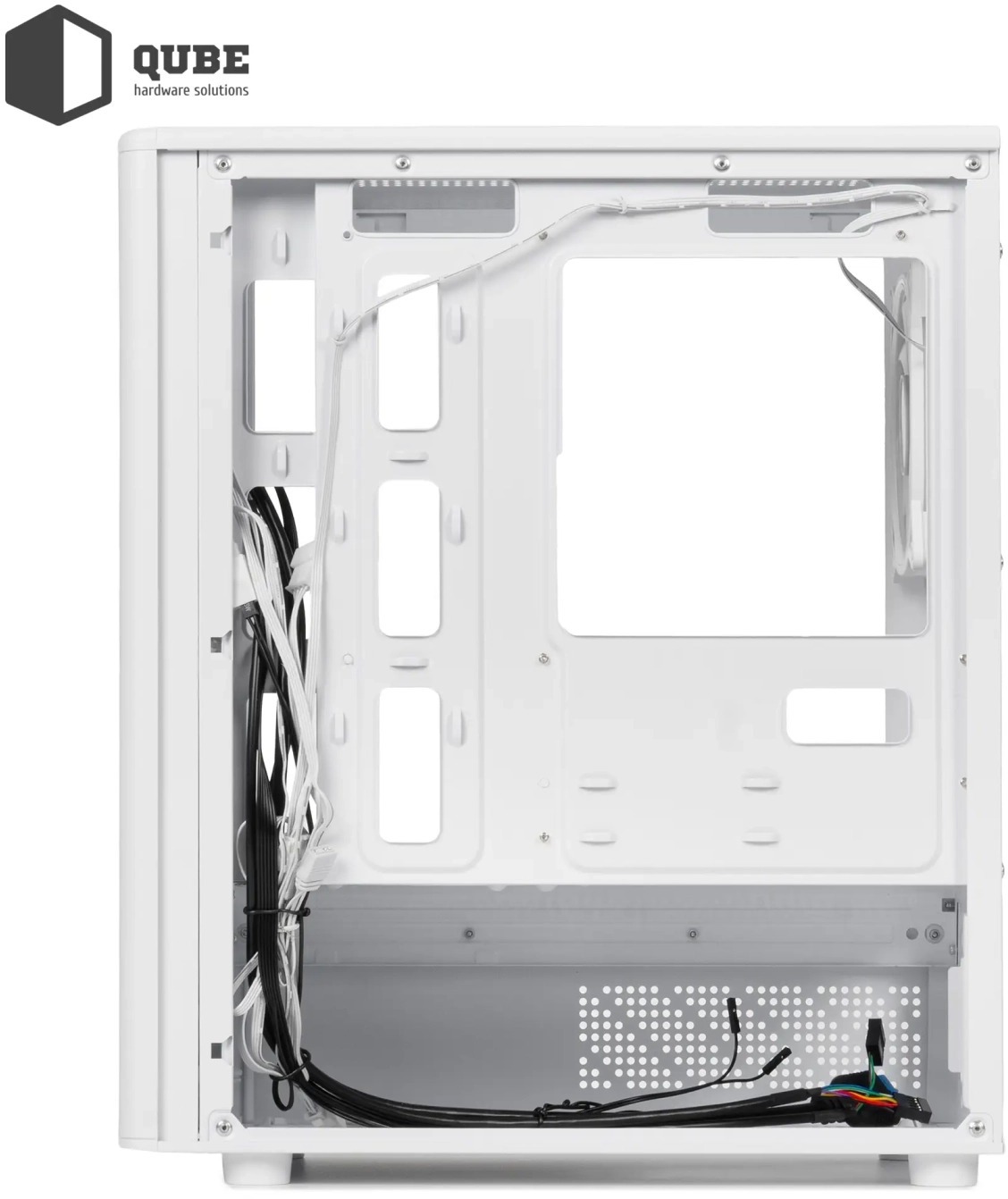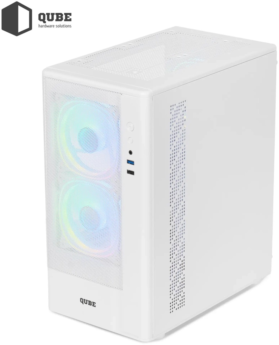 Корпус QUBE GEON ARGB Black – це компактне і сучасне рішення для збірки ПК формату mATX, яке поєднує стильний дизайн, практичність і надійність. Його конструкція виконана з міцної сталі товщиною 0,35 мм, а фронтальна панель з пластику з металевою решіткою забезпечує додатковий приплив повітря та покращене охолодження. Ліва бічна панель із загартованого скла з розсувним механізмом дозволяє легко отримати доступ до комплектувальних і одночасно підкреслює зовнішній вигляд системи з підсвічуванням. Права панель металева, що додає жорсткості корпусу. При габаритах 325×197×387 мм корпус залишається компактним, зберігаючи всі ключові можливості для збірки продуктивної системи.