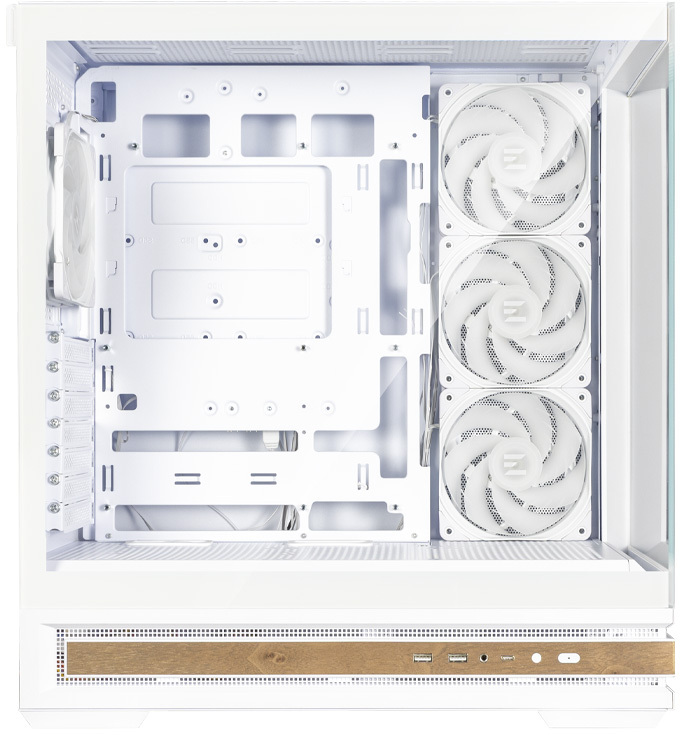 Ця модель не включає блок живлення, дозволяючи обрати оптимальний варіант для вашої конфігурації, а її ключова особливість — дерев'яна обробка, що обгортає нижню частину корпусу, додаючи тепла та елегантності традиційному геймерському стилю, доступна в чорному та білому кольорах для гармонії з будь-яким інтер'єром.