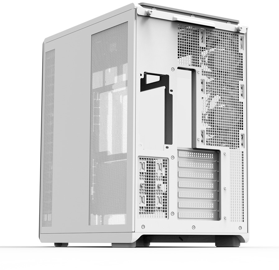 У конфігурації охолодження корпус підтримує до 11 вентиляторів — по три у верхній та нижній секціях, три з боків і два ззаду. Таке рішення гарантує рівномірний повітряний потік і можливість створити як тиху, так і екстремально охолоджену систему.