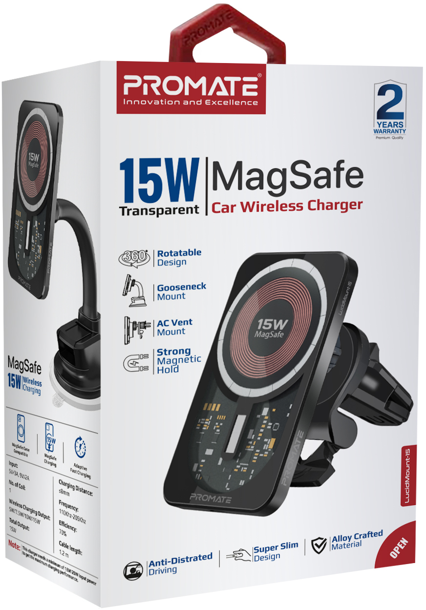 15W MagSafe зарядка, миттєве встановлення телефона на тримач, надійна фіксація, 2 варіанти кріплення і все це в прозорому корпусі з преміальних матеріалів. З Promate LucidMount-15 твій iPhone завжди заряджений і під рукою.