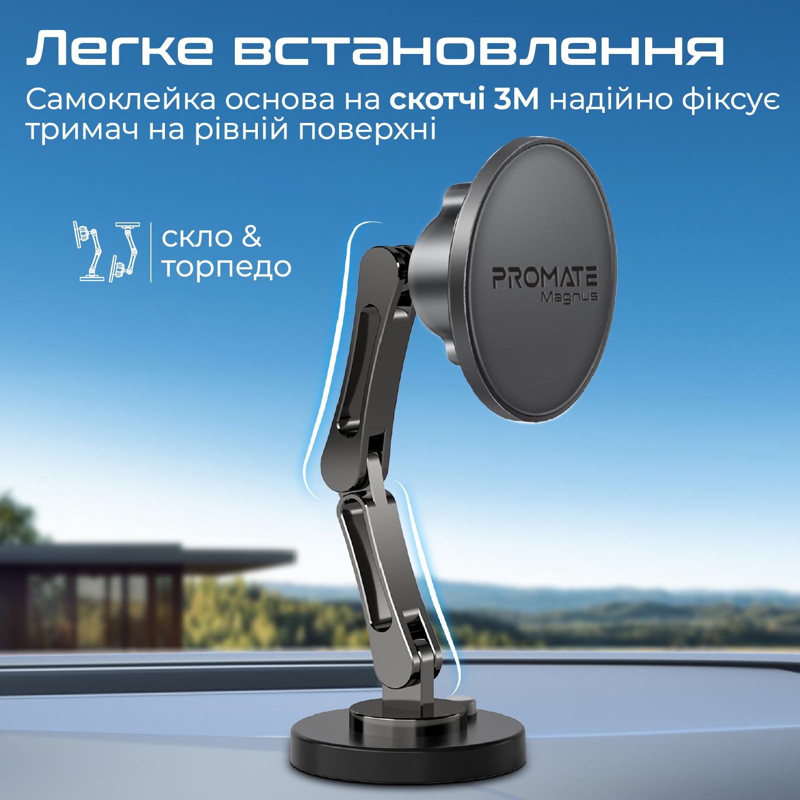 Magnus — модель 2023 року в лінійці магнітних тримачів від Promate. Лаконічний дизайн, рухомий кронштейн, надійне кріплення, простота використання і преміальна якість — ідеальне поєднання для вашого авто!