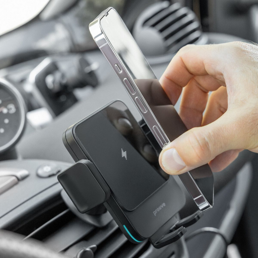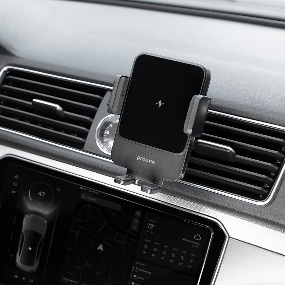 Proove Sonic забезпечує максимальний комфорт та безпеку під час кожної поїздки. Тримач заряджає телефон за допомогою бездоротової зарядки з підтримкою QI, міцно утримує його на місці та залишає легкий доступ до нього.