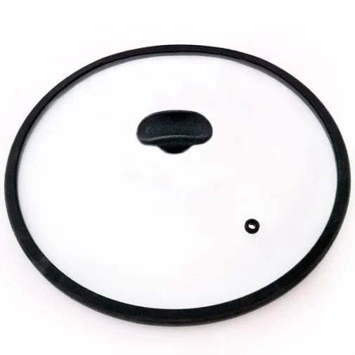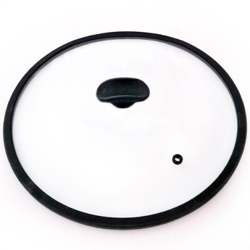 Плоска кришка з жаростійкого боросилікатного скла з силіконовим обідком. Для каструль, сотейників та сковорідок з антипригарним покриттям і не тільки. Щільно закриває посуд, не дряпає верхню кромку. Ручка кришки з бакеліту не нагрівається, не плавиться, зручно лягає в руку.