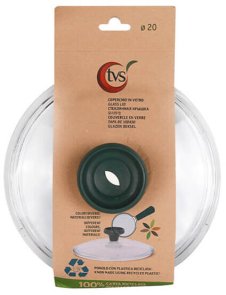 Оснащена зручною зеленою ручкою з переробленого пластику, що підкреслює екологічний підхід бренду. Підходить до всіх каструль і сковорідок TVS, щільно прилягає до країв і зберігає тепло всередині. Кришку можна мити вручну або в посудомийній машині — скло не мутніє й не втрачає прозорості.