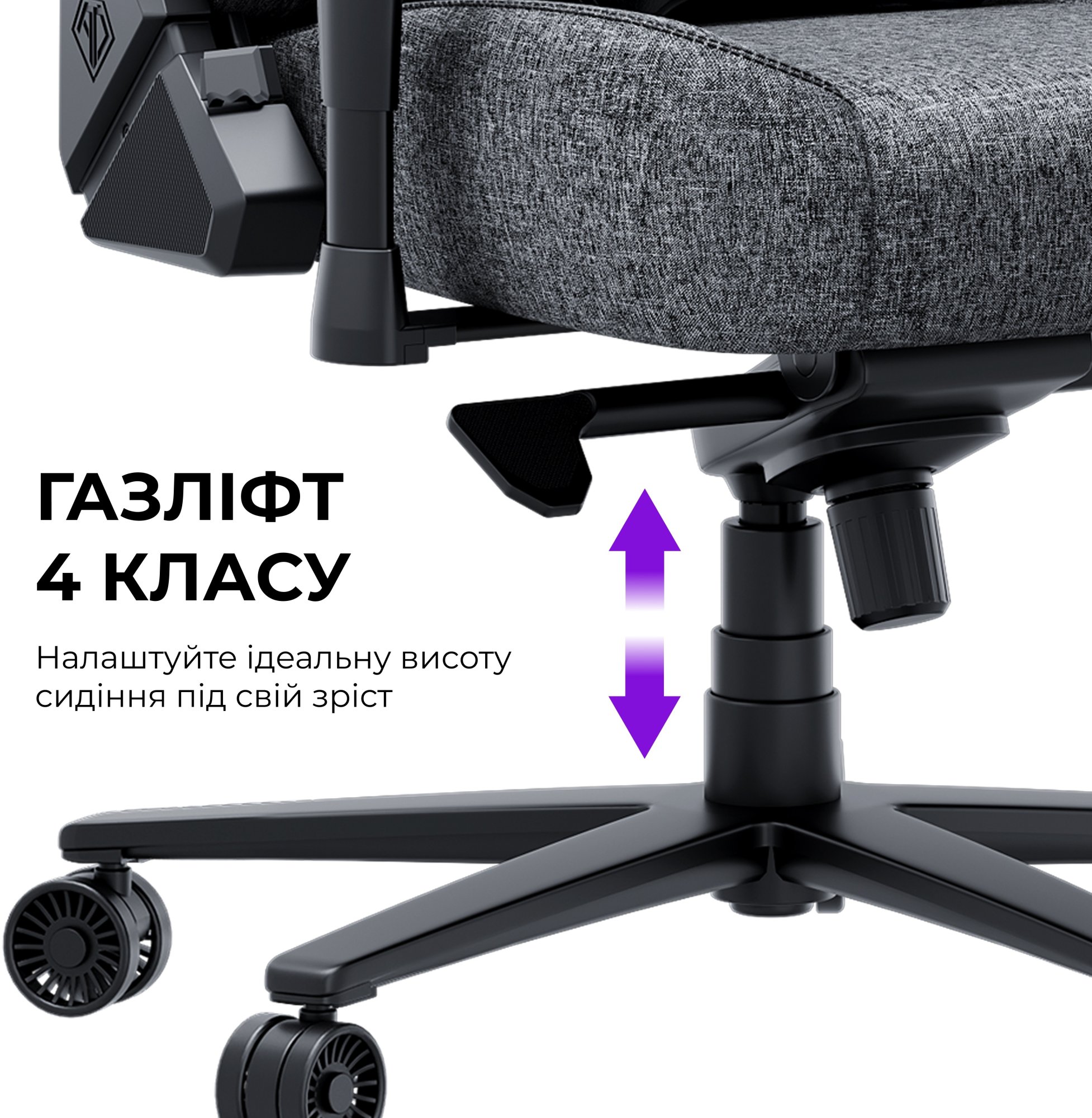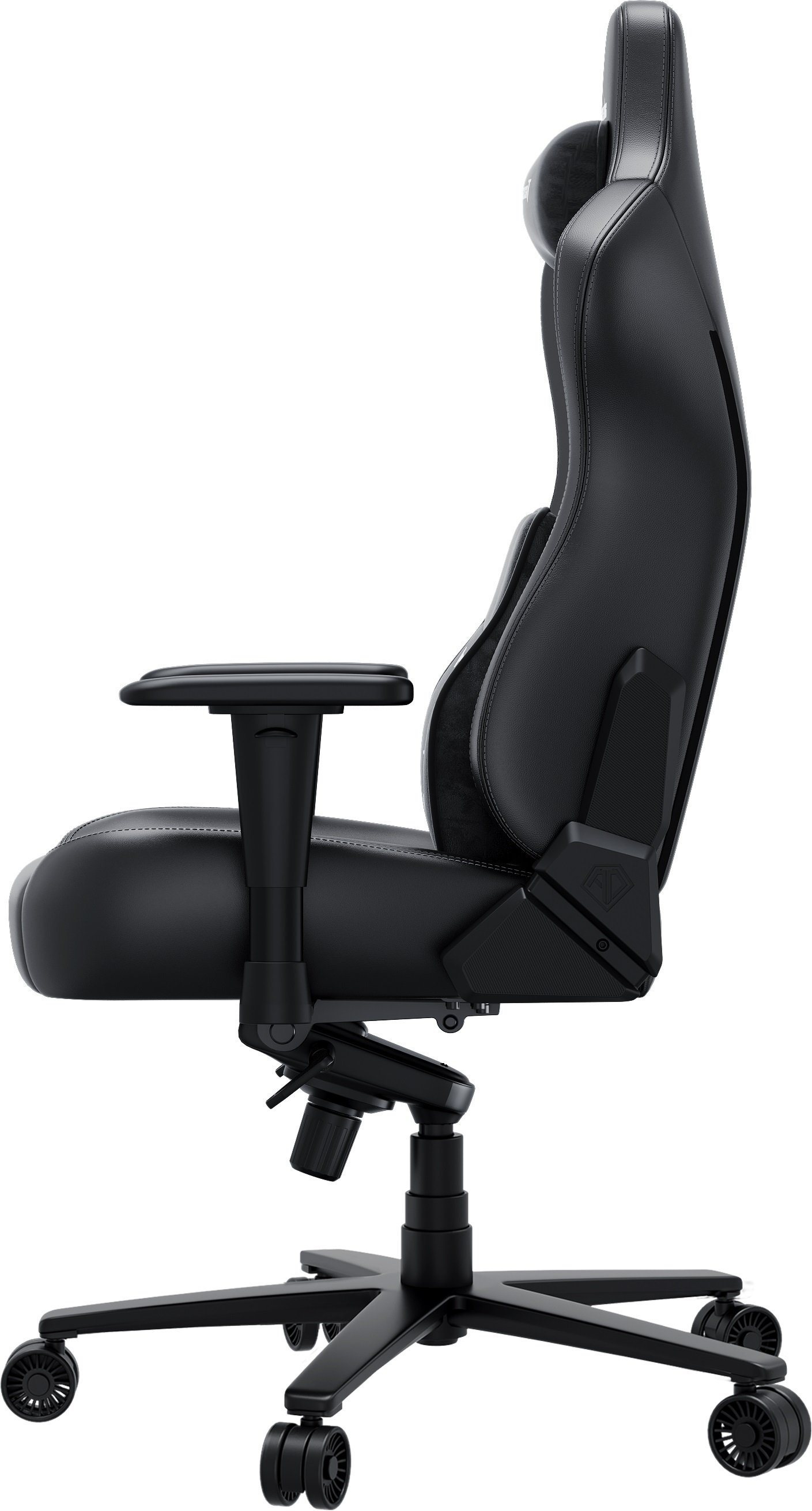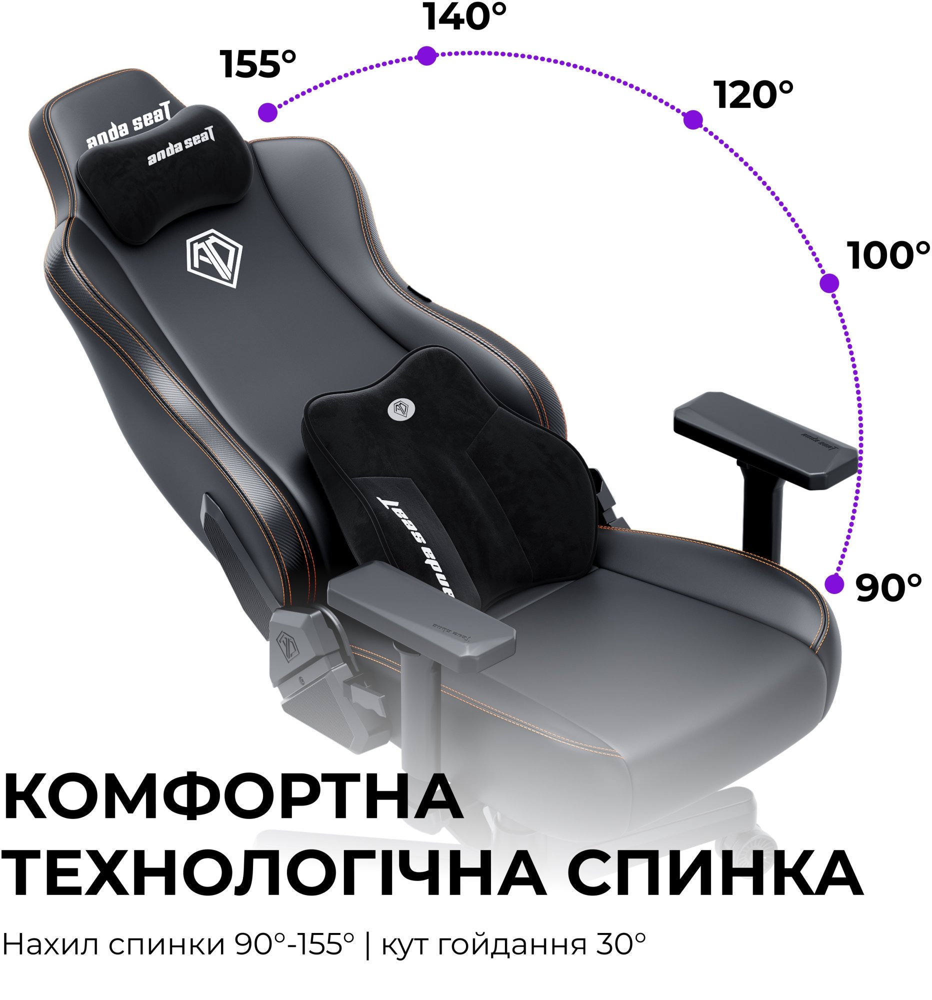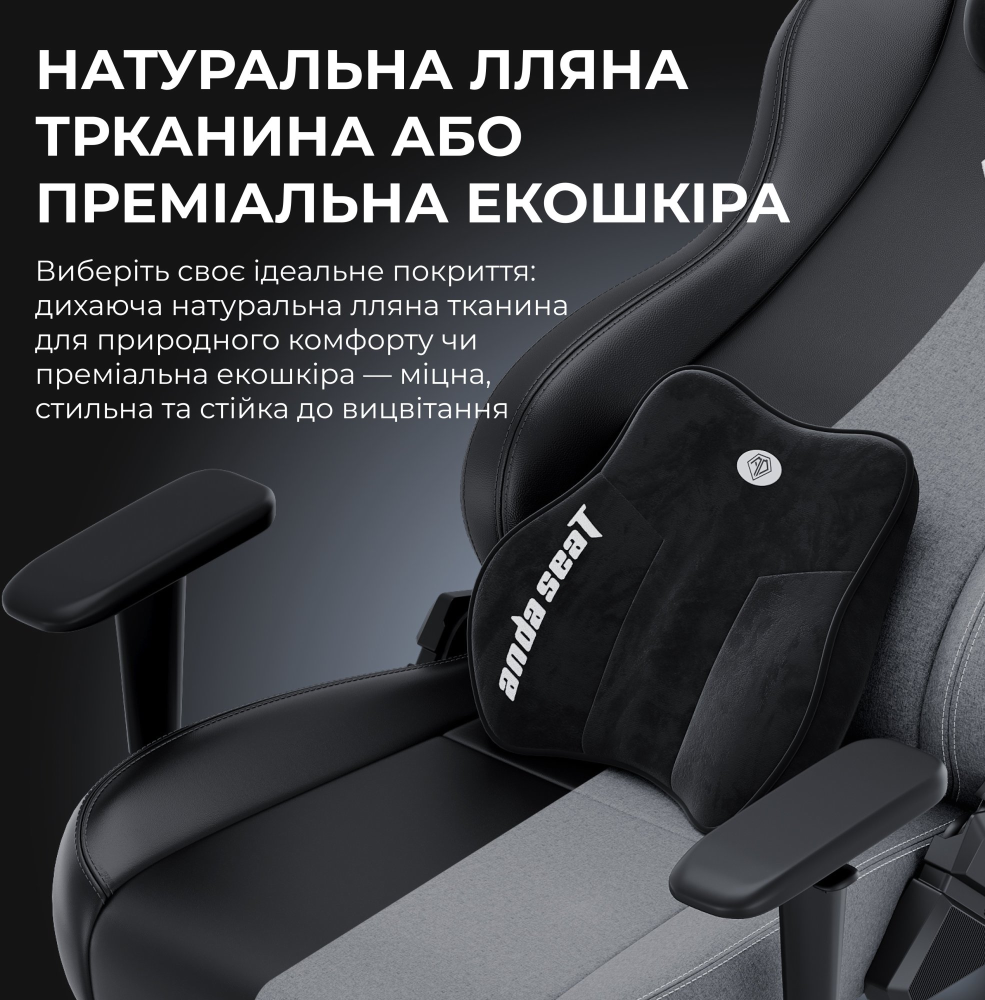 Крісло має стильну чорну оббивку зі штучної шкіри, що дихає і залишається прохолодною навіть у спеку. Крім того, вона стійка до зносу та легка в догляді. Модель створена у форматі XL для користувачів зростом до 210 см і вагою до 150 кг, де широке сидіння з піною високої щільності (60 кг/м³) адаптується до контурів тіла, рівномірно розподіляючи вагу, ніби крісло обіймає вас, підтримуючи поперек і стегна під час марафонів у Cyberpunk 2077 чи багатогодинного кодування.