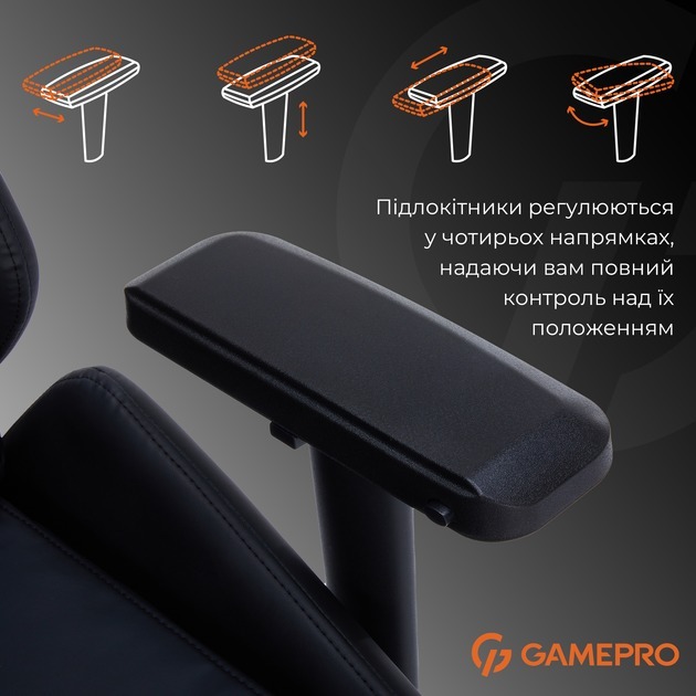 Крісло має 4D-регульовані підлокітники, які дозволяють налаштовувати висоту, кут нахилу, глибину та поворот для ідеальної посадки, а також газовий ліфт класу 4 для плавного регулювання висоти сидіння від 51 до 59 см. Спинка з нахилом до 160 градусів з фіксацією в кількох позиціях, базою на п'яти зірках з поліуретанових коліщаток для плавного ковзання по підлозі без подряпин.