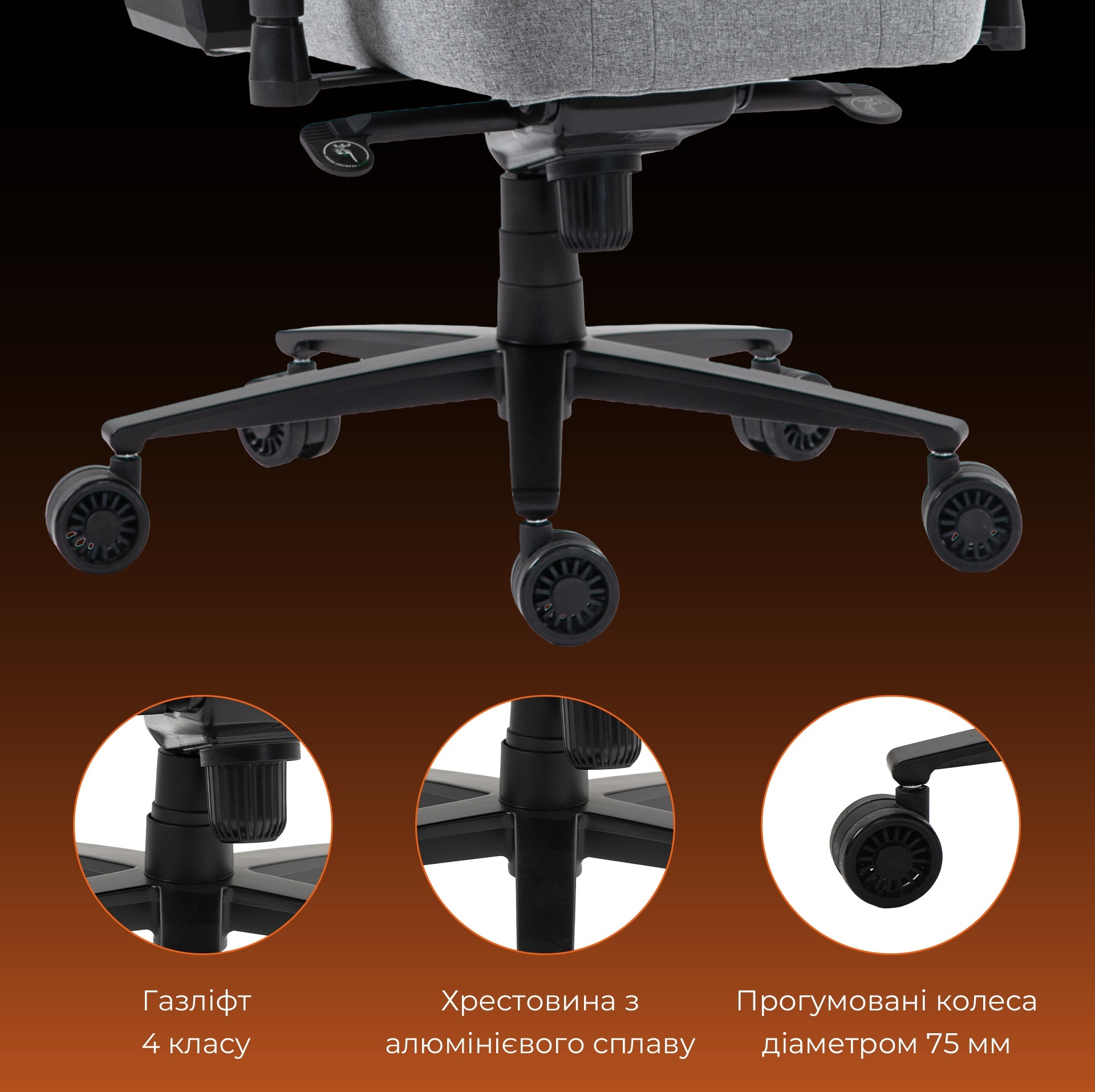 Механізм "мультиблок" гарантує плавне гойдання з можливістю фіксації крісла в зручному положенні. Газліфт 4 класу забезпечує надійне та плавне регулювання висоти, а міцна база з алюмінієвого сплаву додає стійкості. Великі прогумовані колеса діаметром 65 мм дозволяють легко й безшумно пересувати крісло, не пошкоджуючи підлогу.