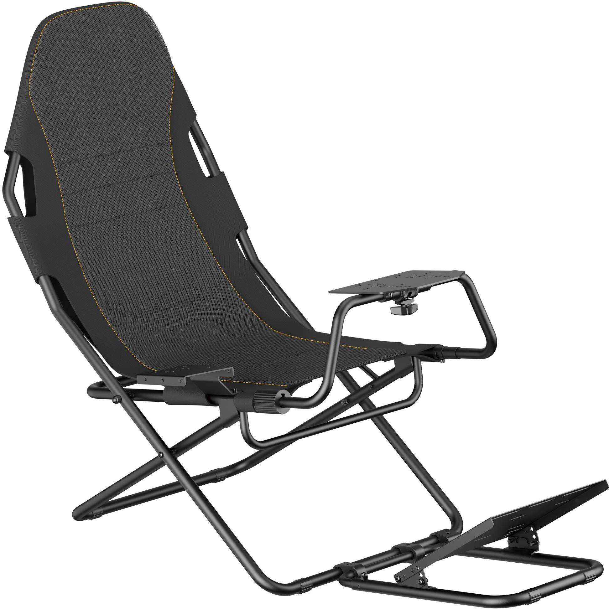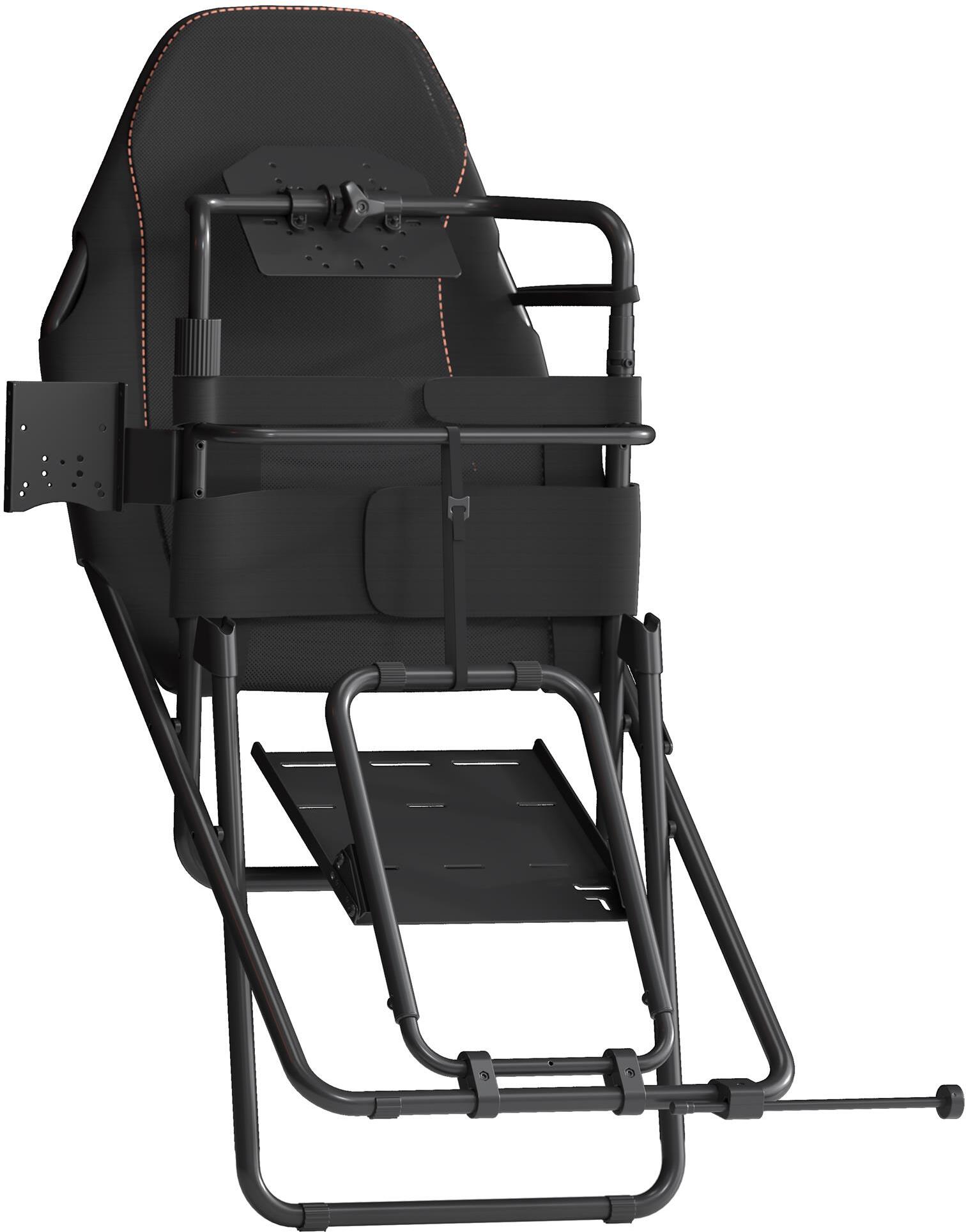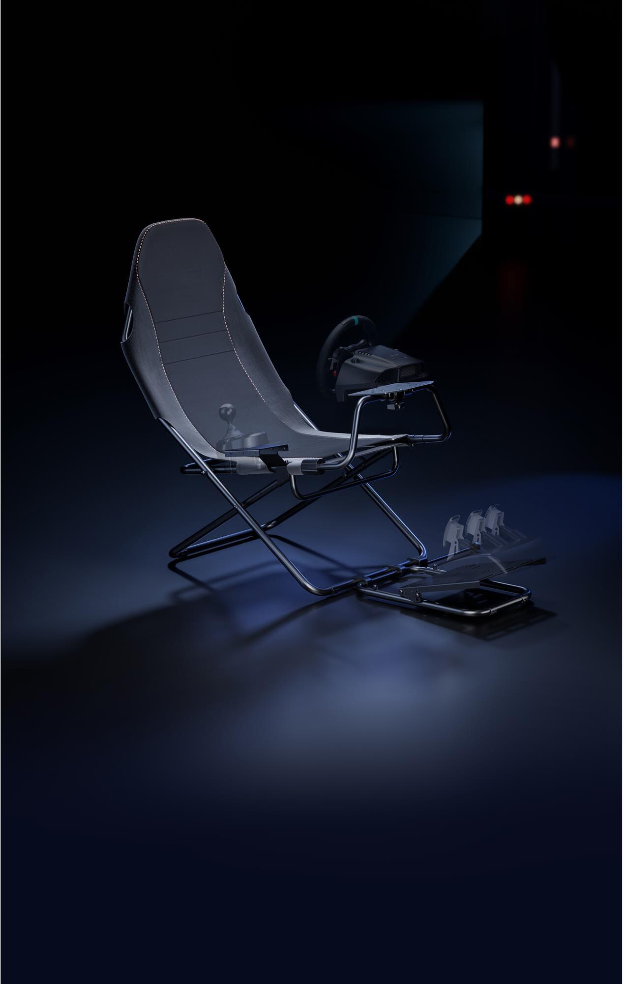 Сидіння виконане у спортивному стилі з поліестеру, що легко очищається, з акцентом на ергономіку для зниження навантаження на спину, а компактні розміри дозволяють розмістити кокпіт у домашніх умовах без значного зайняття простору.