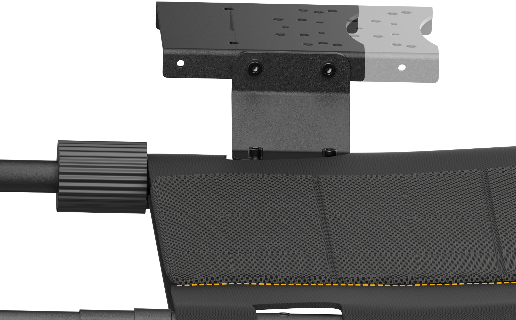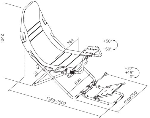 Кріплення для керма має регульований кут нахилу від +50° до -50°, а для педалей — три позиції (0°, 15°, 27°), що забезпечує точне позиціювання обладнання для максимального контролю в іграх. Крісло сумісне з більшістю популярних брендів ігрових аксесуарів, таких як Fanatec, Logitech, MOZA та Thrustmaster, що робить його універсальним для різних сетапів.