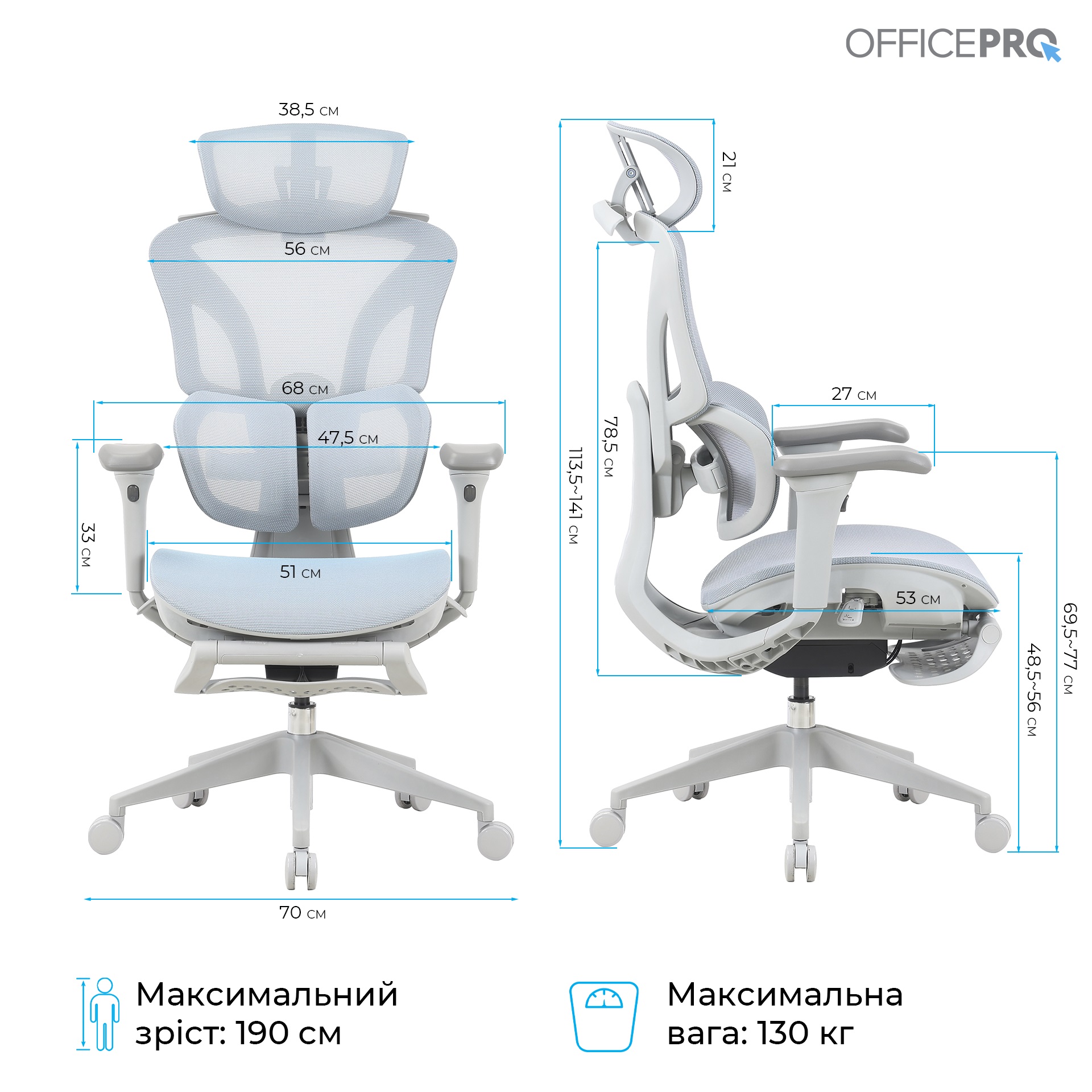 Крісло розраховане на вагу до 130 кг і підходить для людей зростом до 190 см. Суцільне сітчасте покриття спинки та сидіння забезпечує вільну циркуляцію повітря, запобігаючи перегріву. Газліфт 4-го класу, нейлонова база та поліуретанові колеса діаметром 60 мм гарантують довговічність і плавність рухів. Officepro Elite — ідеальний вибір для тих, хто цінує комфорт, ергономіку та якість у кожній деталі.