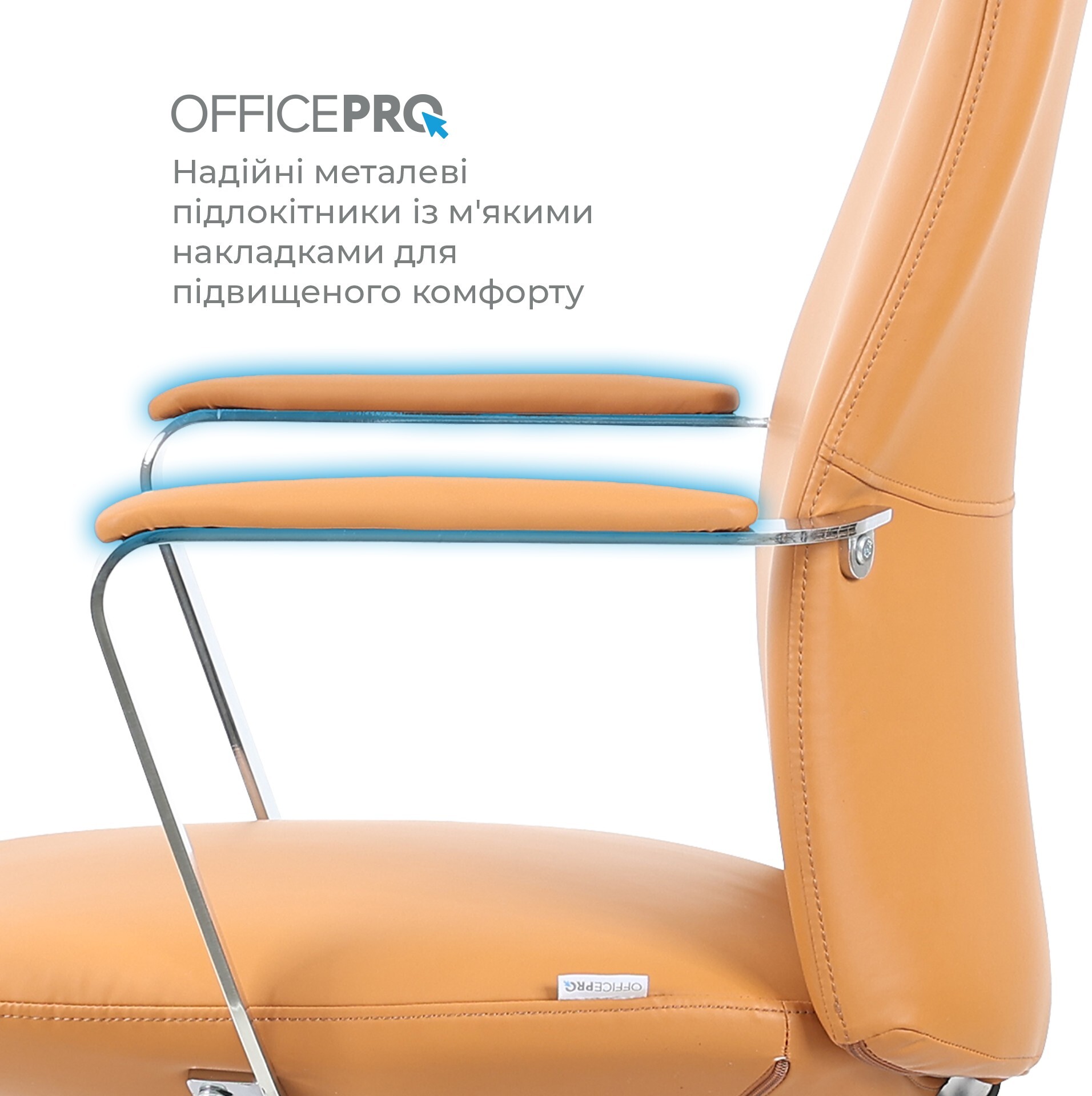 Модель оснащена надійними металевими підлокітниками з м’якими накладками, які дарують приємні тактильні відчуття та надійну підтримку рук. Покриття з екошкіри не тільки приємне на дотик, але й вирізняється високою зносостійкістю та легкістю в догляді, зберігаючи бездоганний вигляд довгий час, а наповнення з м’якої піни всередині сидіння та спинки гарантує підвищений комфорт і рівномірний розподіл навантаження.