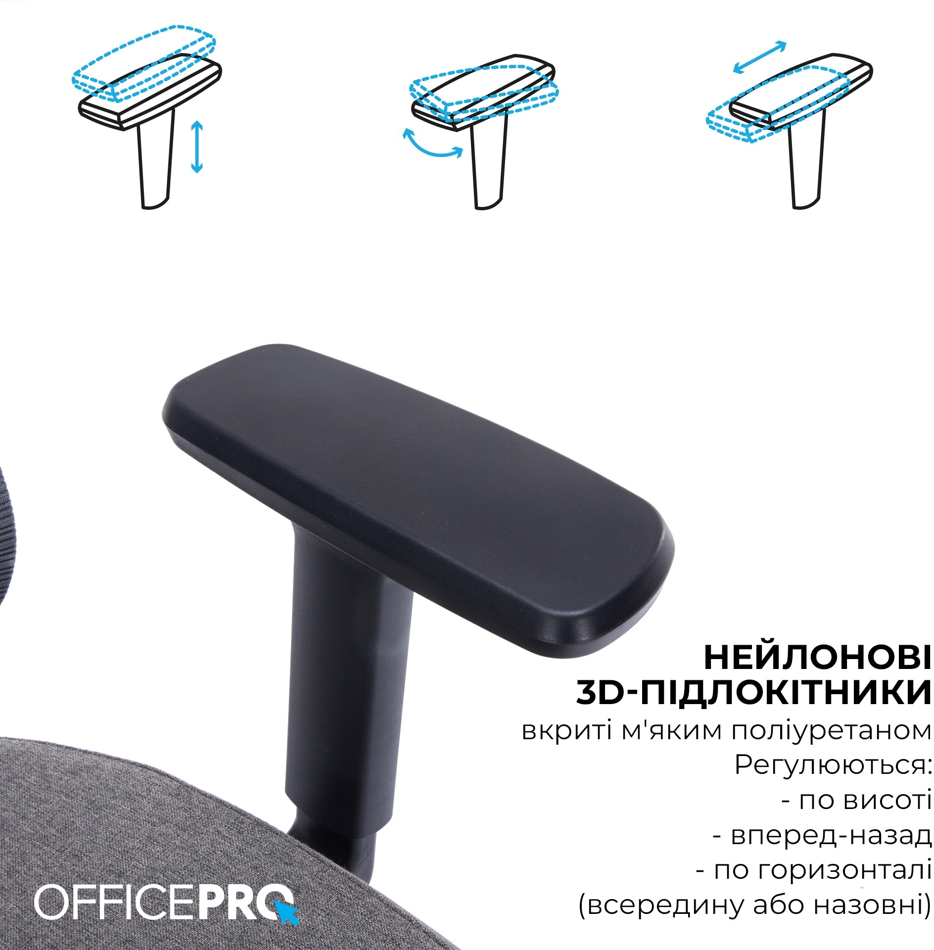 Нейлонові 3D підлокітники, покриті м'яким поліуретаном, регулюються за висотою, вперед-назад і змінюють кут повороту по горизонталі (назовні або всередину). Для регулювання нахилу та фіксації спинки, у кріслі використовується синхромеханізм, що у поєднанні з функцією регулювання глибини сидіння надає ще більше комфорту.