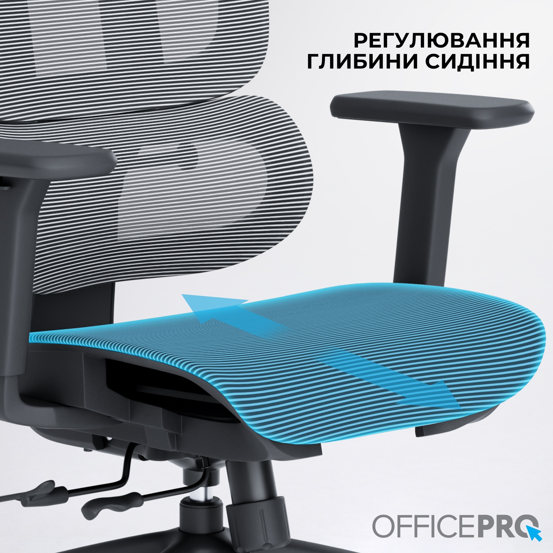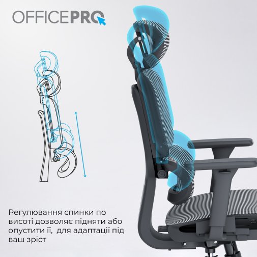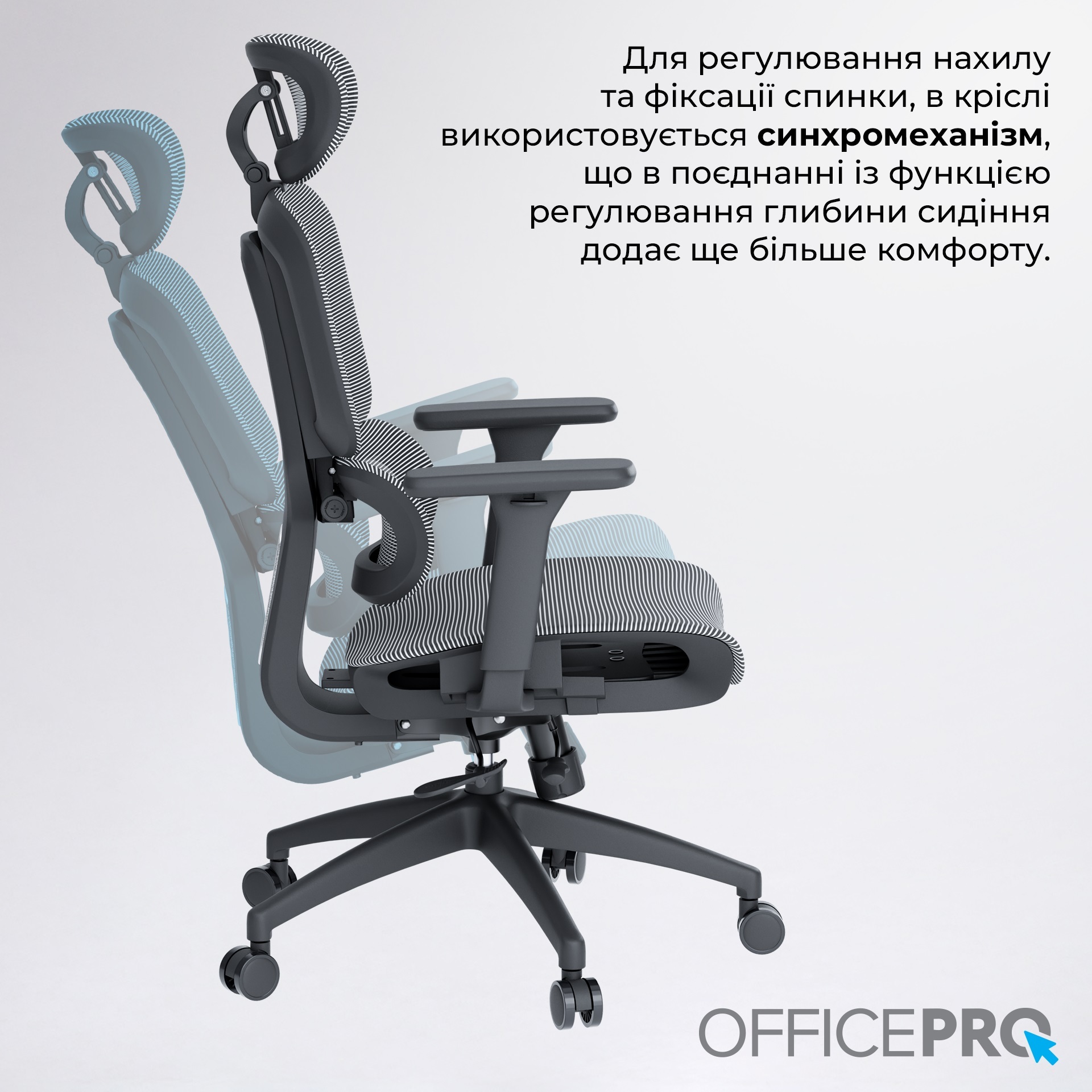 Регульована поперекова підтримка забезпечує ергономічно правильне положення спини, щоб запобігти перенапрузі при тривалому сидінні. Кут нахилу та висота підголівника регулюється для оптимального позиціювання. А завдяки регулюванню спинки за висотою ви можете налаштувати зручне положення спинки для свого зросту.