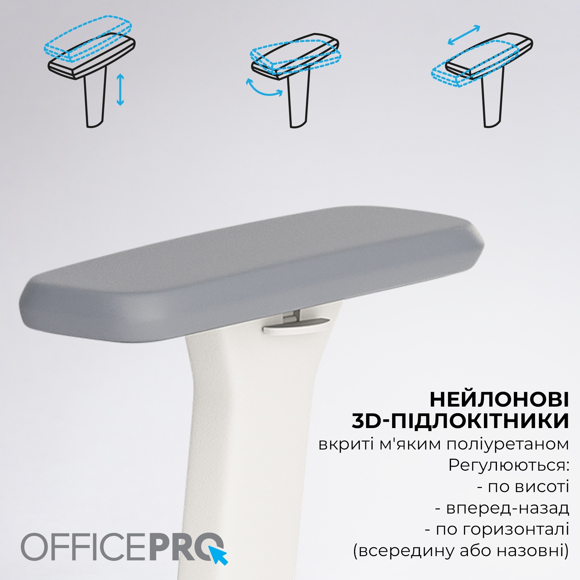 Нейлонові 3D підлокітники, покриті м'яким поліуретаном, регулюються за висотою, вперед-назад і змінюють кут повороту по горизонталі (назовні або всередину). Для регулювання нахилу та фіксації спинки, у кріслі використовується синхромеханізм, що у поєднанні з функцією регулювання глибини сидіння надає ще більше комфорту.