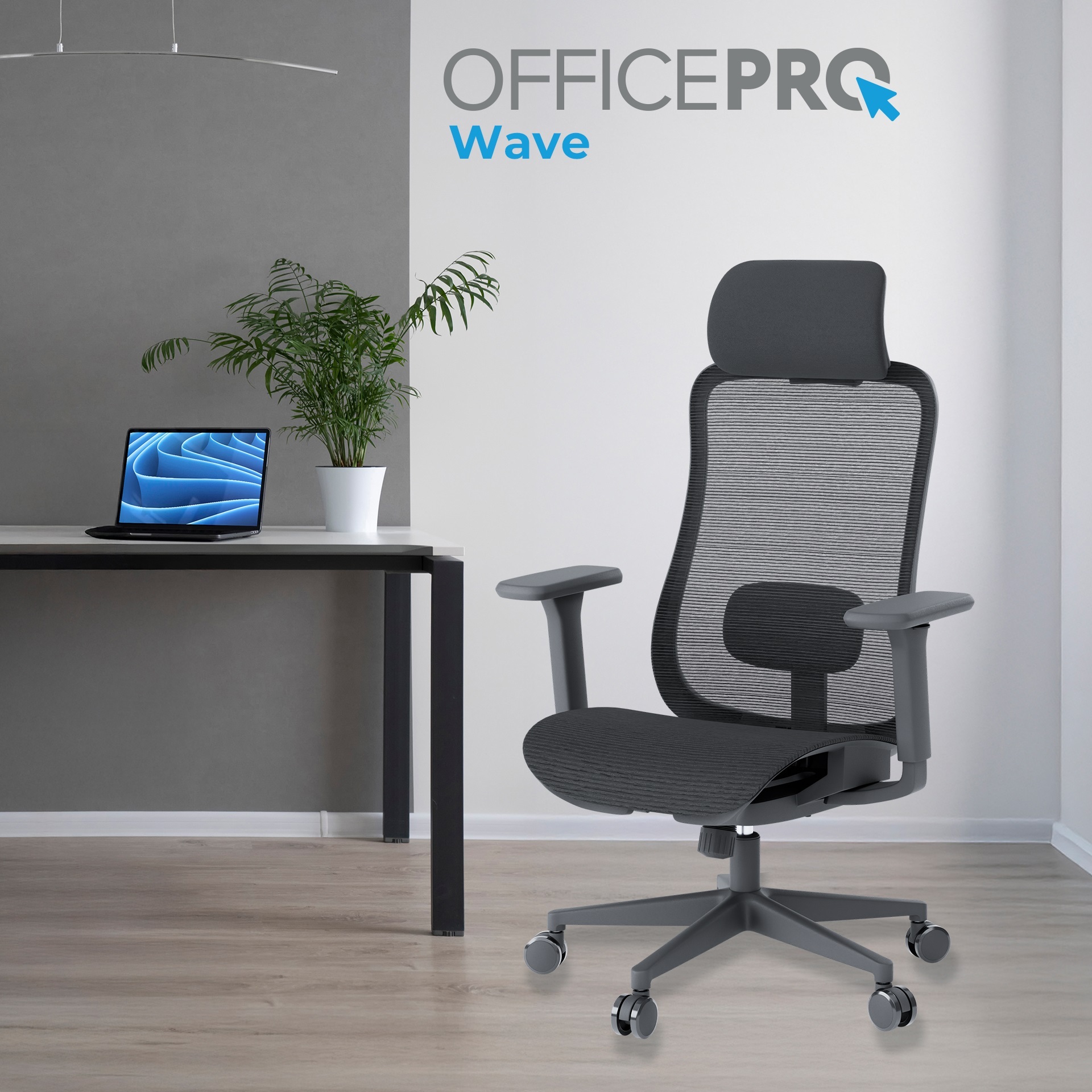 Офісне крісло Officepro Wave — ідеальне поєднання комфорту та ергономіки для сучасного робочого простору. Крісло оснащене сітчастим покриттям, яке забезпечує оптимальну циркуляцію повітря, запобігаючи перегріву під час тривалого сидіння.