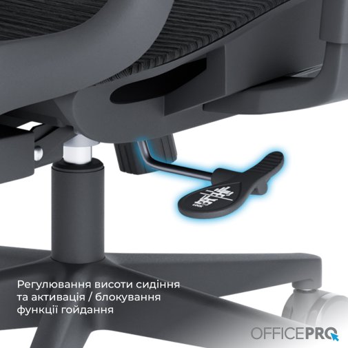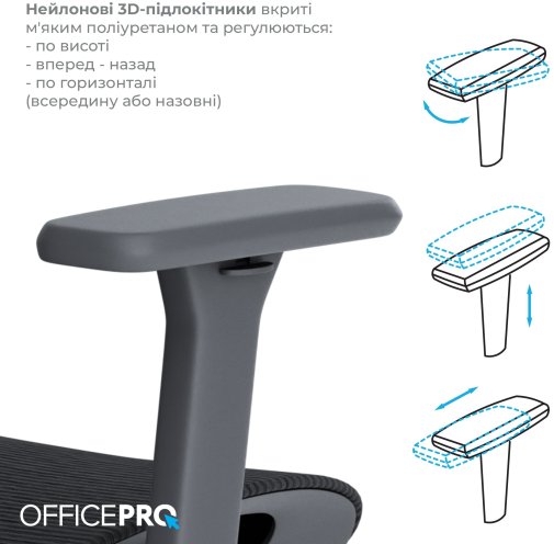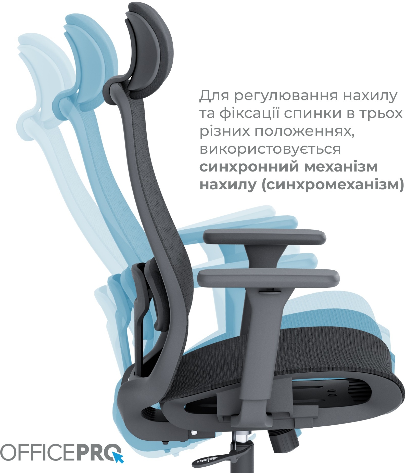 Крісло має нейлонові 3D-підлокітники, оббиті м'яким поліуретаном, які регулюються по висоті, вперед-назад, а також по горизонталі. Синхронний механізм нахилу (синхромеханізм) дозволяє фіксувати спинку в трьох положеннях, а функція регулювання висоти сидіння та гойдання забезпечує додаткові можливості персоналізації під час роботи.