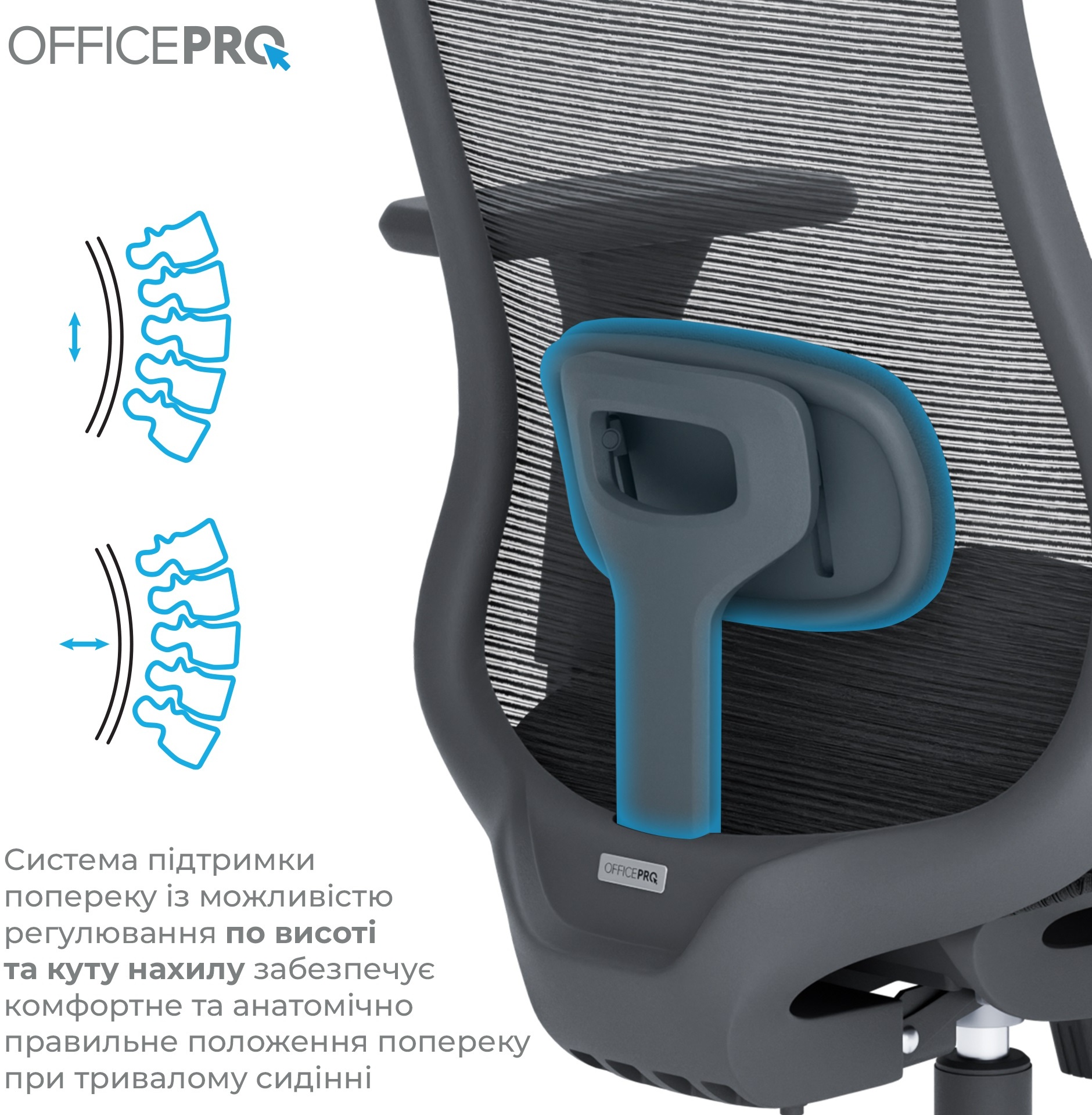 Регульований підголівник з м'якою піною дозволяє індивідуально налаштувати положення для максимального комфорту та підтримки голови. Система підтримки попереку з регулюванням висоти та кута нахилу забезпечує анатомічно правильне положення спини, зменшуючи навантаження.