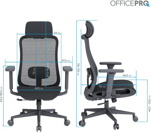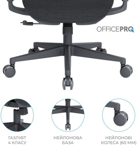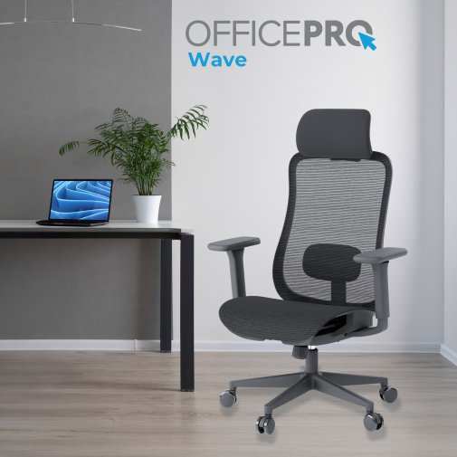 Крісло встановлено на міцній нейлоновій базі з колесами розміром 60 мм, що забезпечує стабільність і плавність переміщення. Officepro Wave — ідеальний вибір для тих, хто цінує комфорт, якість та сучасний дизайн.