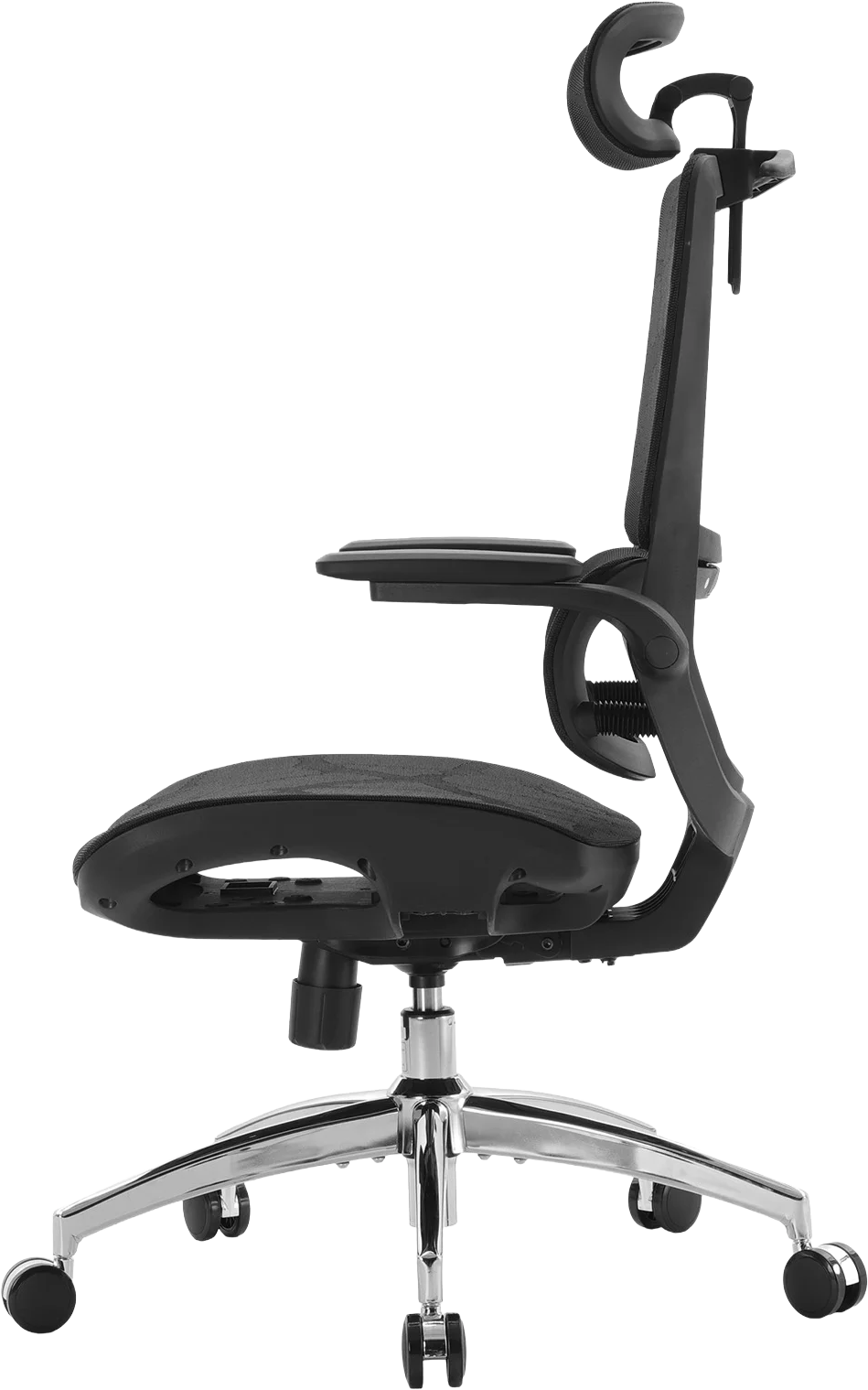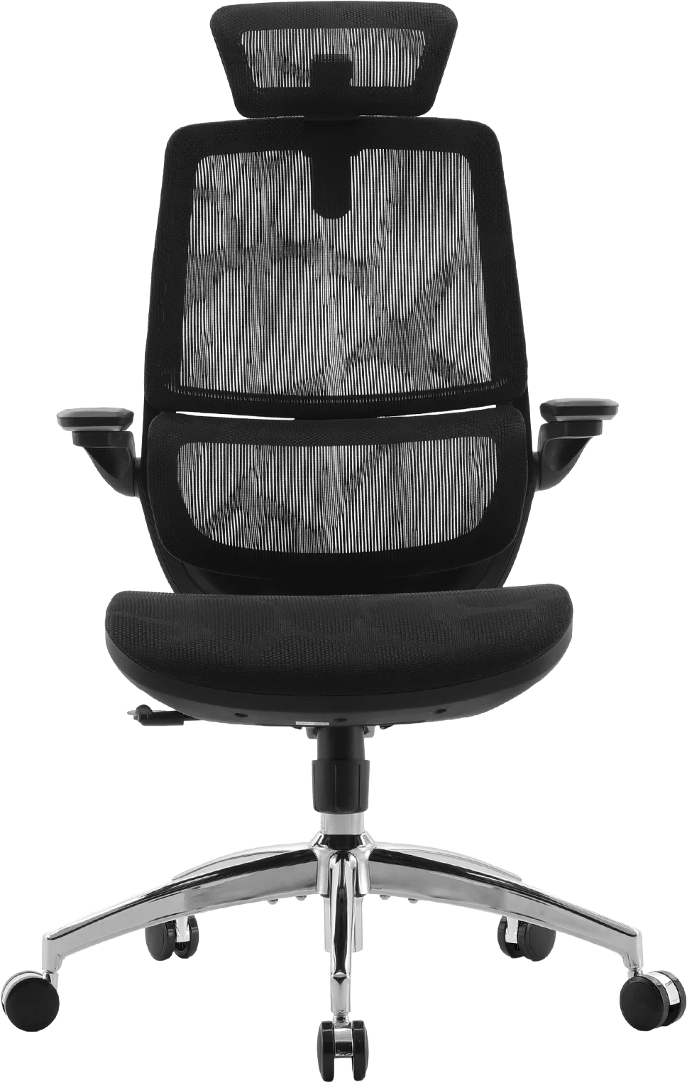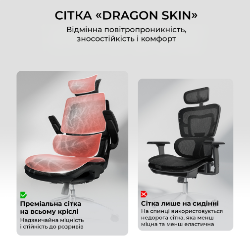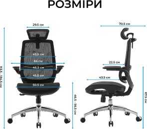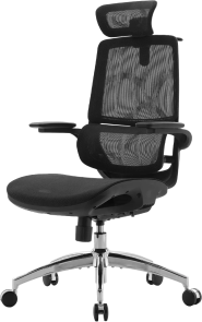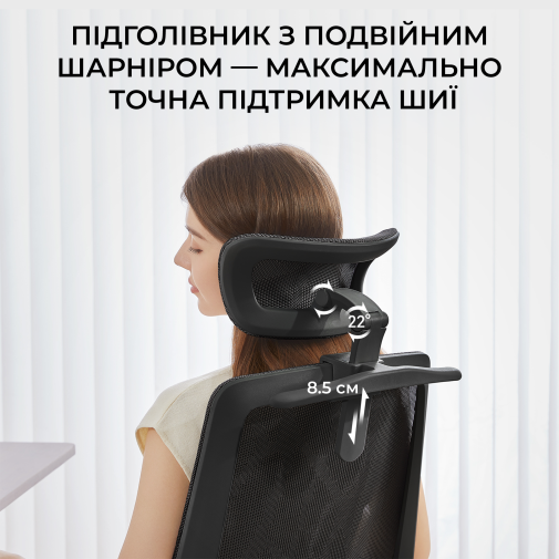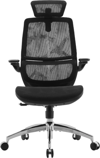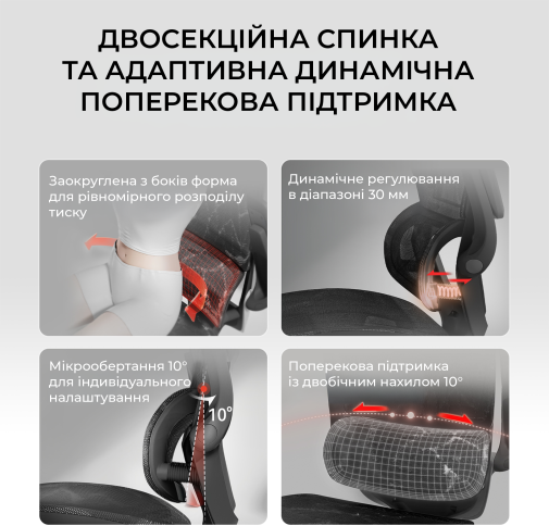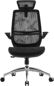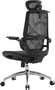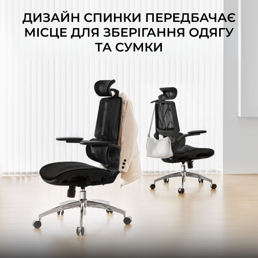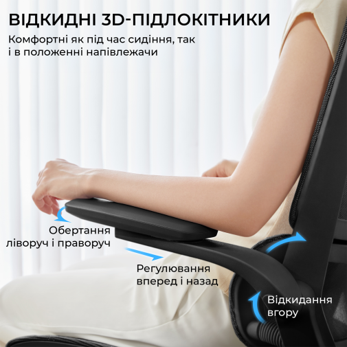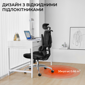 Конструкція крісла включає двосекційну спинку, яка щільно повторює природний вигин хребта, а динамічна поперекова підтримка адаптується до вашої постави в будь-якій позиції. Це дозволяє знизити втому навіть після багатогодинної роботи. Висока спинка та подвійний регульований підголівник забезпечують додаткову підтримку шиї і плечового пояса, а 3D-регульовані підлокітники зі складною функцією «flip-up» дають змогу налаштувати оптимальне положення для рук або повністю піднімати їх, щоб звільнити додаткове місце.