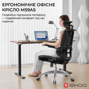 Sihoo M59AS — сучасне ергономічне офісне крісло, створене для максимального комфорту під час тривалого сидіння — роботи з комп’ютером, навчання або ігор. Завдяки продуманій конструкції та регульованим елементам ця модель забезпечує всебічну підтримку тіла, зменшуючи навантаження на спину, шию та плечі.