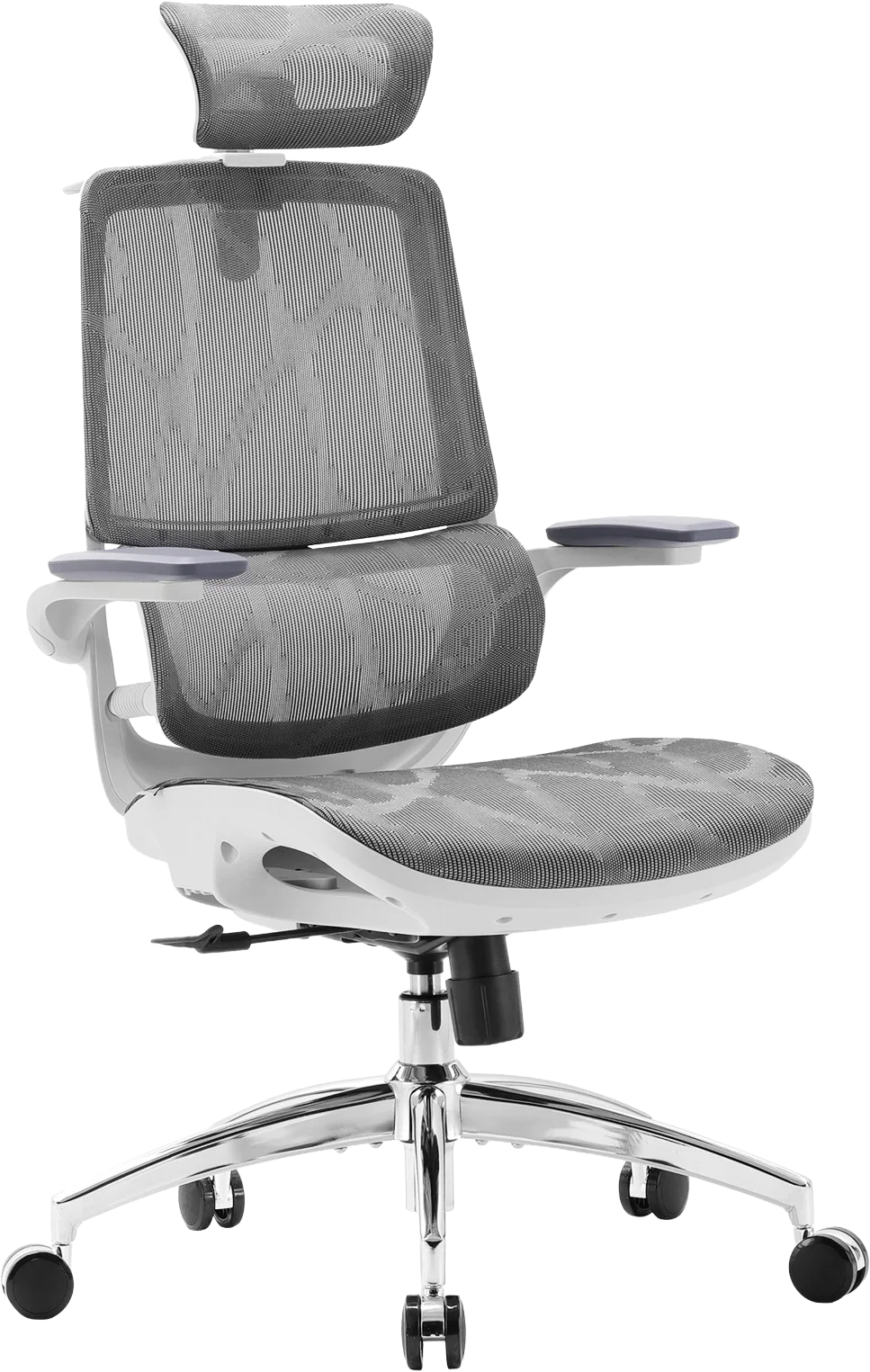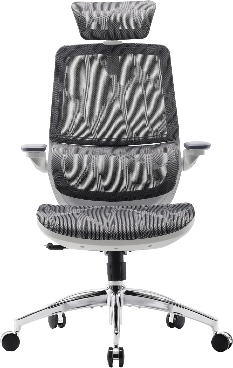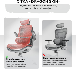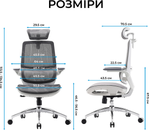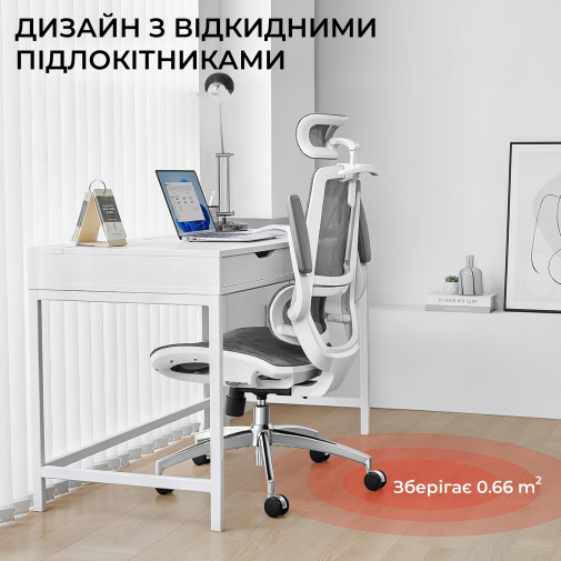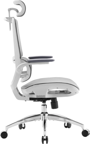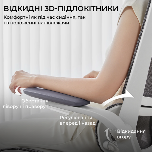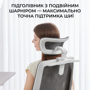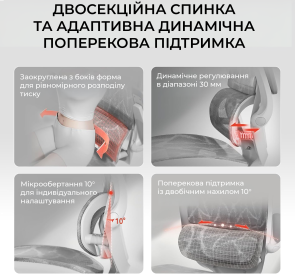 Конструкція крісла включає двосекційну спинку, яка щільно повторює природний вигин хребта, а динамічна поперекова підтримка адаптується до вашої постави в будь-якій позиції. Це дозволяє знизити втому навіть після багатогодинної роботи. Висока спинка та подвійний регульований підголівник забезпечують додаткову підтримку шиї і плечового пояса, а 3D-регульовані підлокітники зі складною функцією «flip-up» дають змогу налаштувати оптимальне положення для рук або повністю піднімати їх, щоб звільнити додаткове місце.
